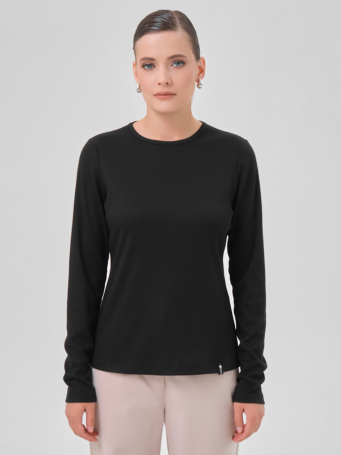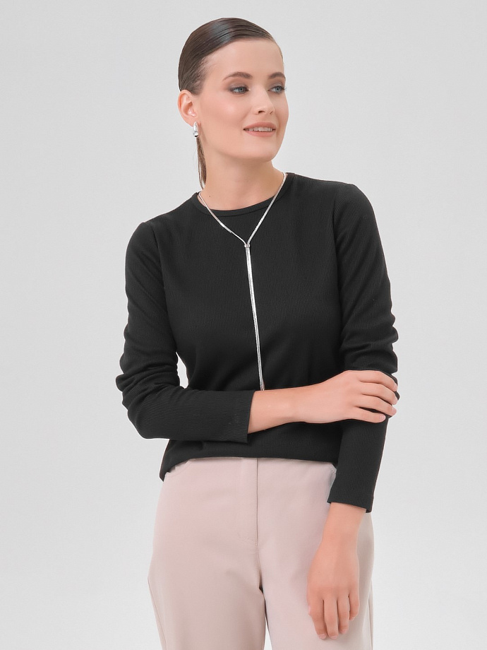 Модель полуприлегающего силуэта, с длинным рукавом. Горловина обработана бейкой. По низу декоративный элемент.