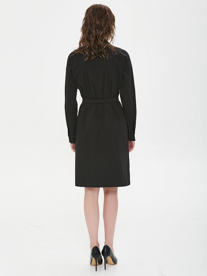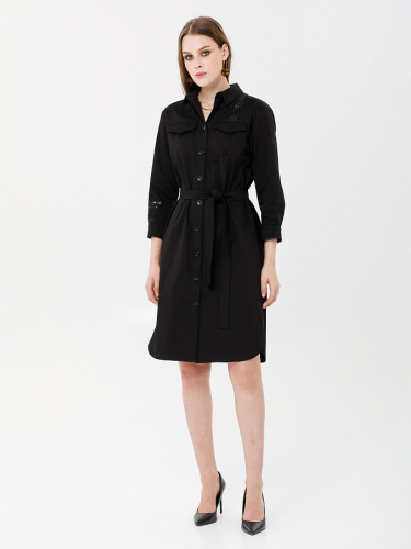 Модель прямого силуэта, с рельефами, со спущенным плечом, без подклада. Спереди планка с застёжкой на кнопки и V-образный вырез горловины. Воротник отложной. По низу рукава разрез, защипы и манжета с застёжкой на кнопку. Талия подчёркнута съёмным поясом с пряжкой. Платье декорировано отделочными строчками и текстовым принтом на поясе.