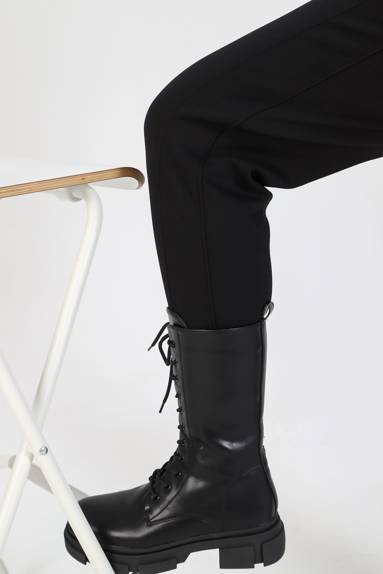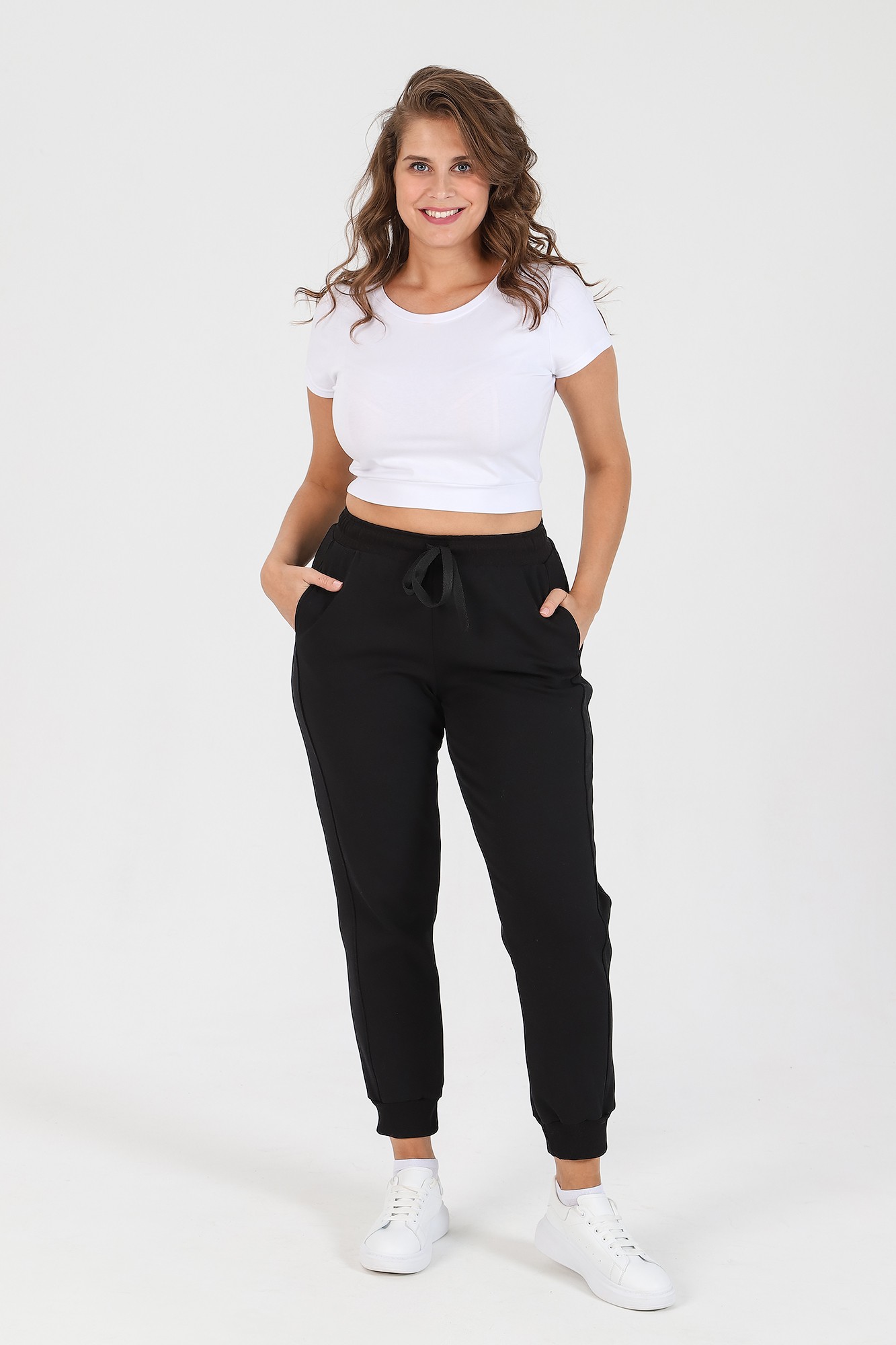 Брюки – длинные, на притачном поясе с эластичной тесьмой внутри и манжетами по низу. Передние половины – из двух частей каждая, со смещением соединительных швов в сторону боковых срезов. Соединительные швы передних половин с карманами. Пояс и манжеты выполнены из трикотажного полотна «кашкорсе».