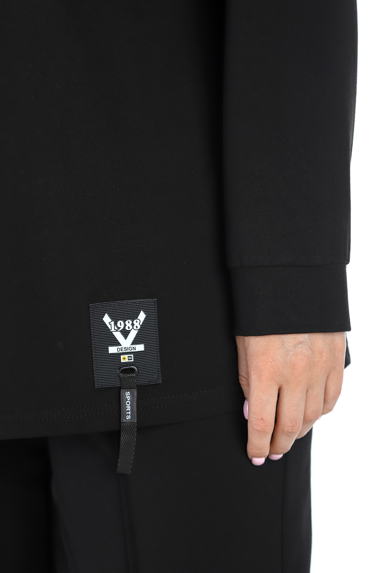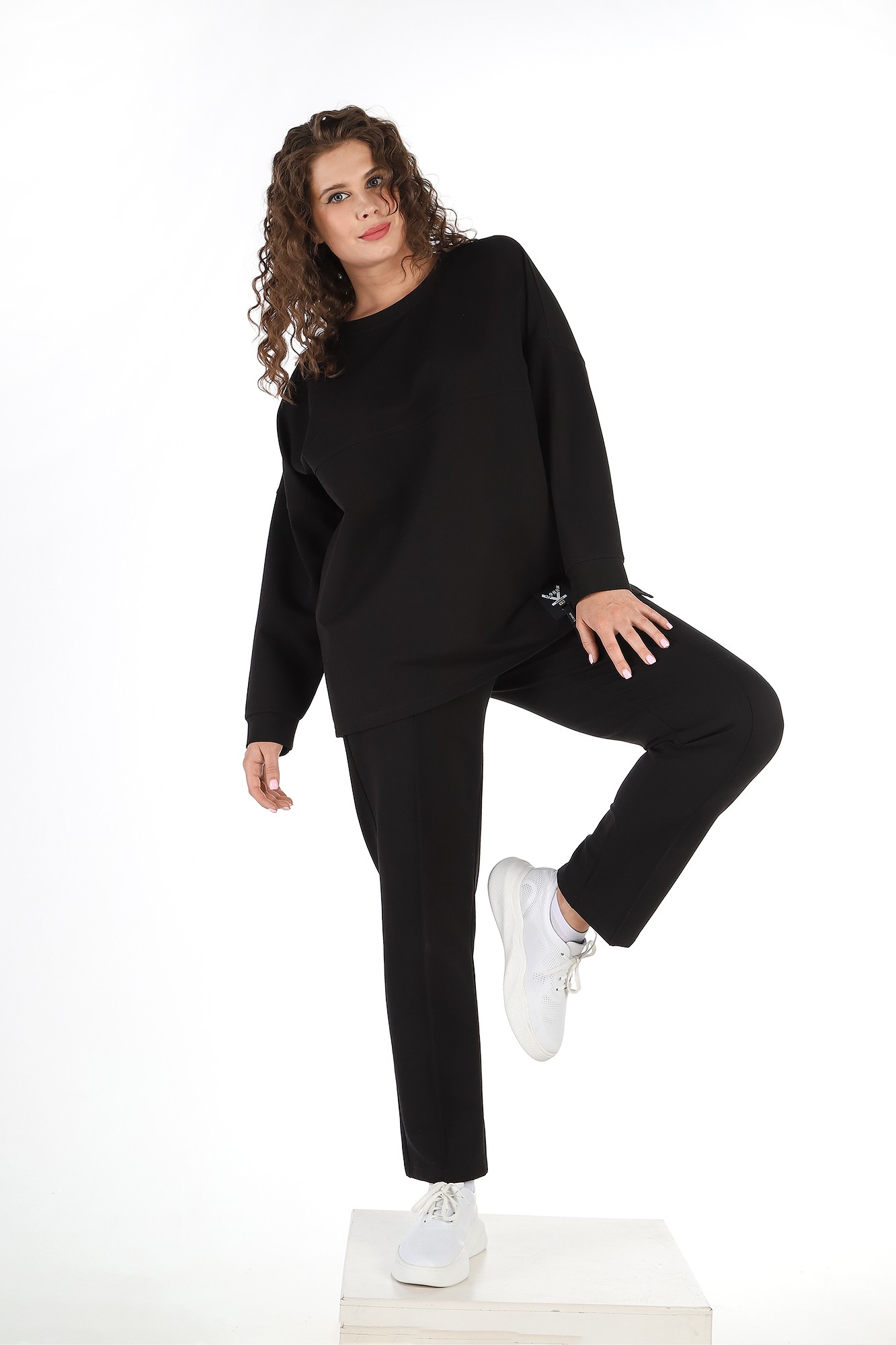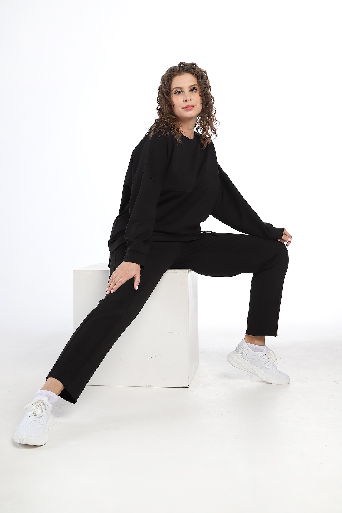 Костюм молодежный из гладкокрашеного трикотажного полотна «футер-двунитка», состоящий из джемпера и брюк. Джемпер – с втачными длинными рукавами, горловиной овальной формы, обработанной втачной планкой, разрезами в боковых швах и принтом на передней детали, выполненным в технике шелкографии. Основная деталь переда отрезная на уровне груди, рукава – с притачными манжетами, по низу полочки настрочен декоративный элемент. Брюки длинные, классического покроя, на притачном поясе с эластичной тесьмой внутри и карманами в боковых швах. Передние половины застрочены по линиям центра, на задних половинах обработаны две вытачки в области линии талии.