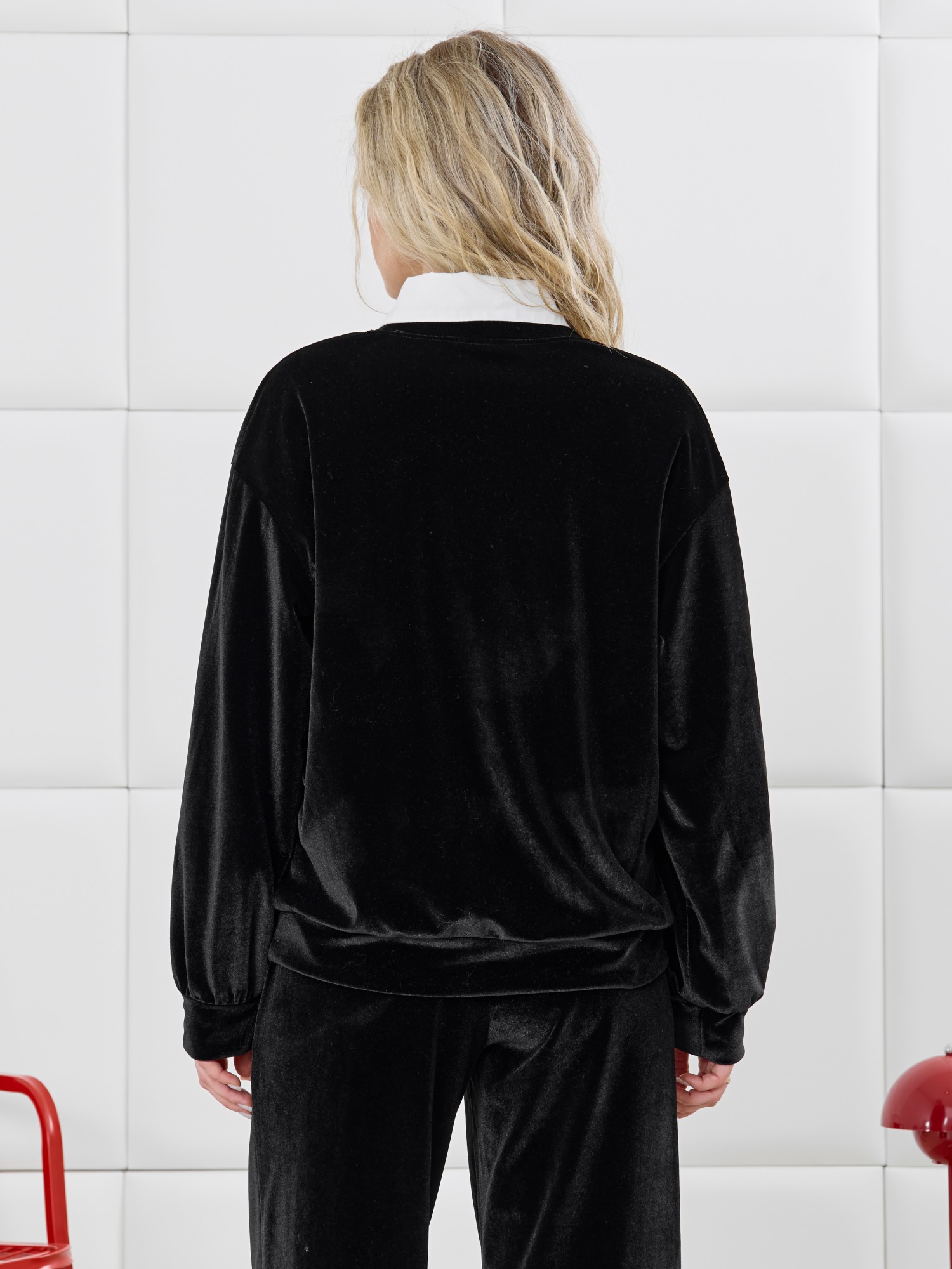 Костюм молодежный из гладкокрашеного трикотажного полотна велюр-стрейч с эффектом «бархат», состоящий из джемпера и брюк. Джемпер – прямого силуэта, с длинными втачными рукавами, горловиной овальной формы, обработанной втачной планкой, притачным поясом понизу и вышивкой на полочке. Рукава – с притачными манжетами.Брюки – длинные, свободные, на притачном поясе с эластичной тесьмой внутри, карманами в боковых швах.