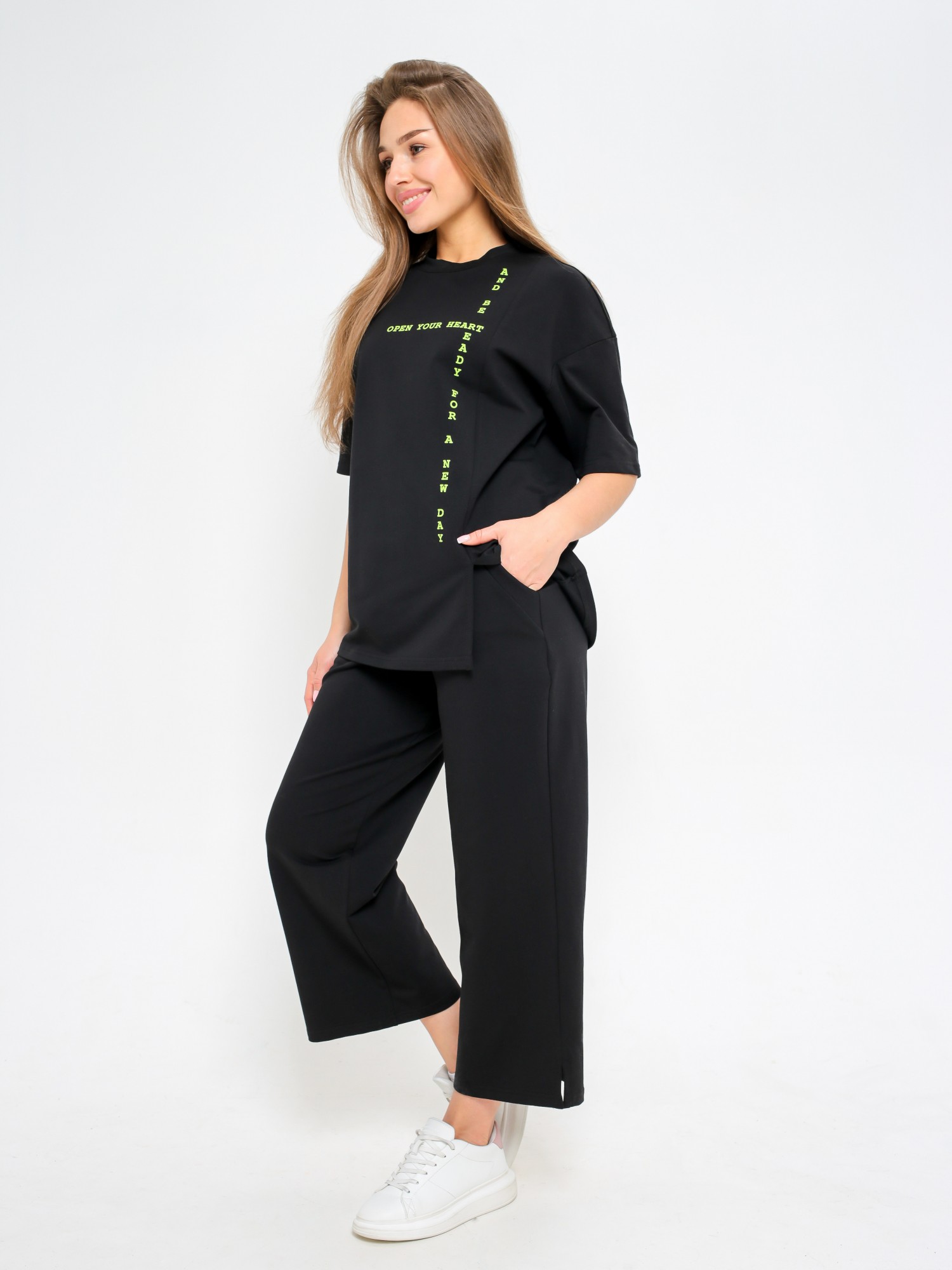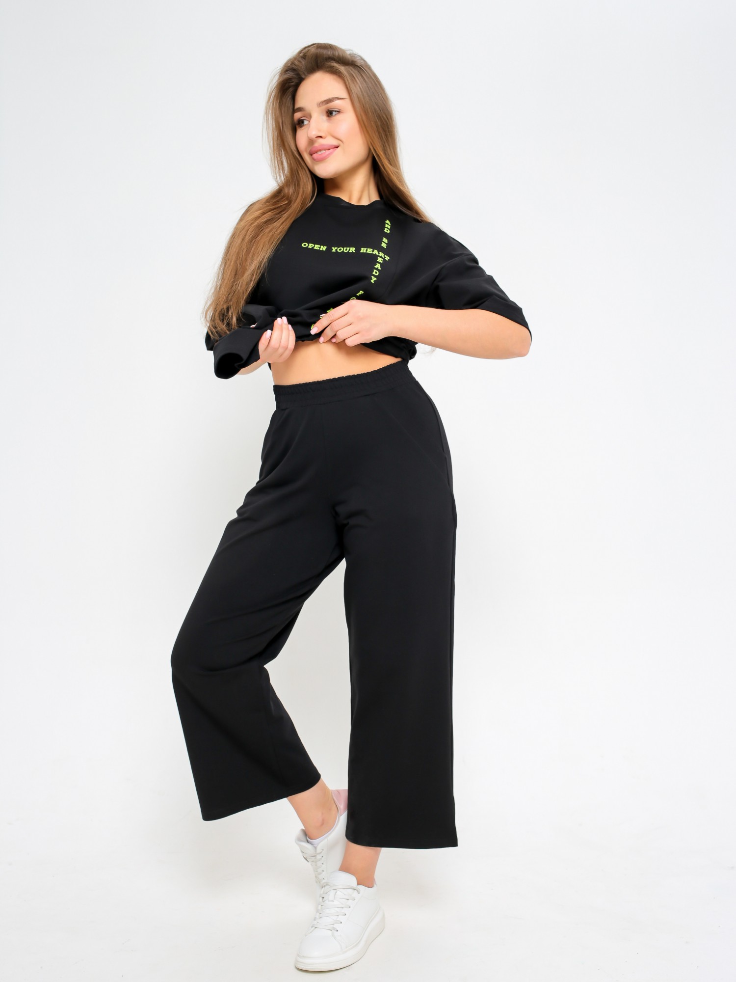 Костюм молодежный из гладкокрашеного трикотажного полотна «футер-двунитка», состоящий из футболки и брюк-кюлотов.