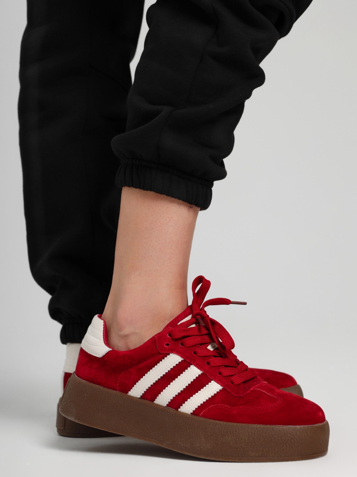 Брюки из трикотажного меланжированного полотна «футер-трехнитка», длинные, с карманами в боковых швах и эластичной тесьмой по талии. Передние половины – из трех частей каждая. Нижние срезы обработаны подгибкой с эластичной тесьмой. В подгибку верхнего среза через две обметанные петли для регулирования степени прилегания брюк по талии вставлен шнур, завязывающийся спереди.