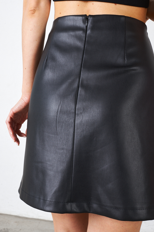 Юбка-мини из эластичного полотна, с покрытием, имитирующим кожу, расширенная книзу. Сзади по среднему шву застёжка-молния. Изделие без пояса, верхний срез обработан обтачкой. В таблице размеров представлены параметры человека, а не изделия.