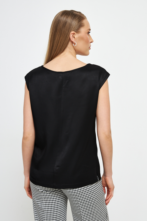 Топ из вискозной ткани с сатиновым блеском. Свободный силуэт, с небольшими разрезами в боковых швах. Круглый вырез горловины и линии проймы окантованы косыми бейками из основной ткани.