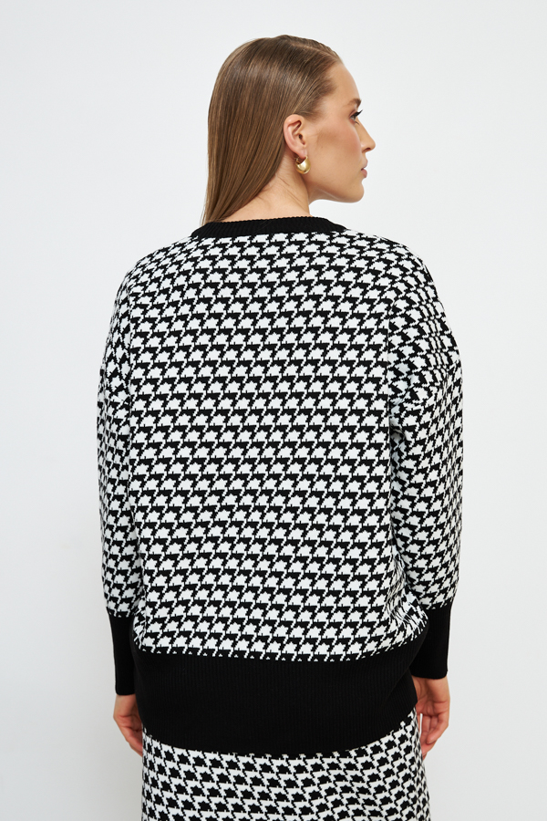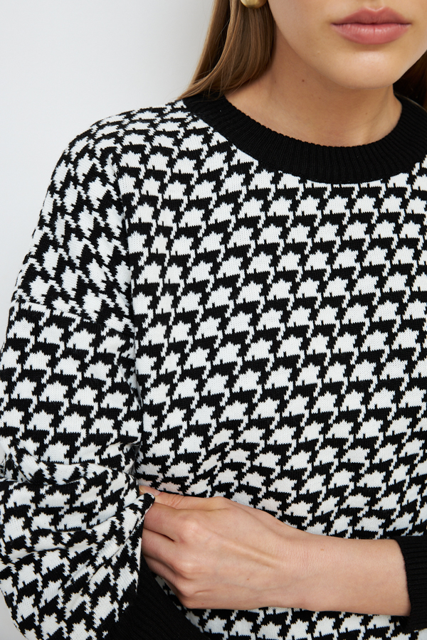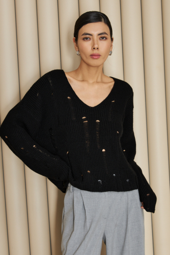 Джемпер свободного силуэта со спущенной линией плеча и длинным рукавом. Круглый вырез горловины оформлен резинкой, низ изделия и низ рукава-высокой резинкой. Изделие выполнено из мягкой структурированной пряжи.