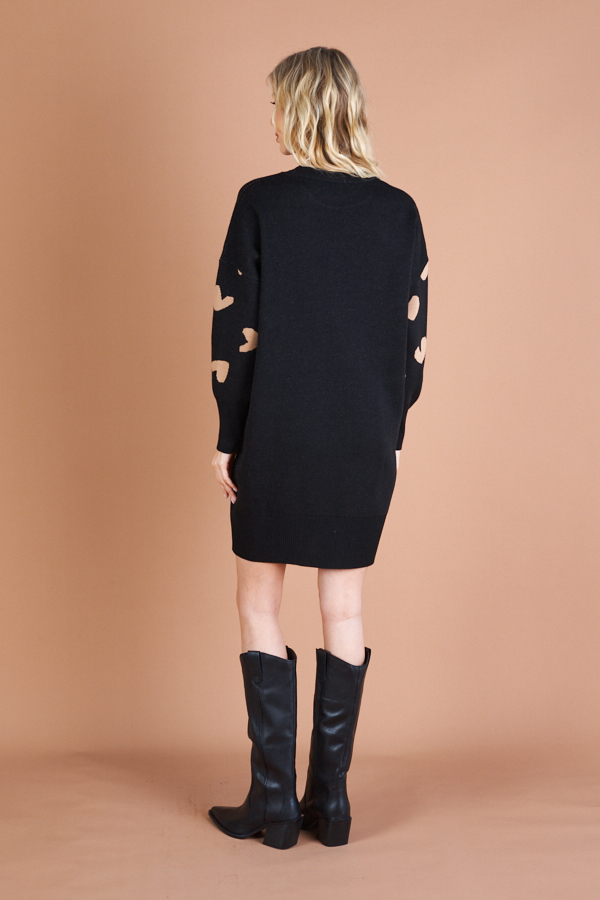 Платье свободного силуэта с узором «сердечки» на передней части. Изделие со спущенной линией плеча и длинным рукавом. Низ изделия и низ рукава с высокой резинкой. Круглый вырез горловины оформлен резинкой-бейкой. Изделие выполнено из мягкой структурированной пряжи.