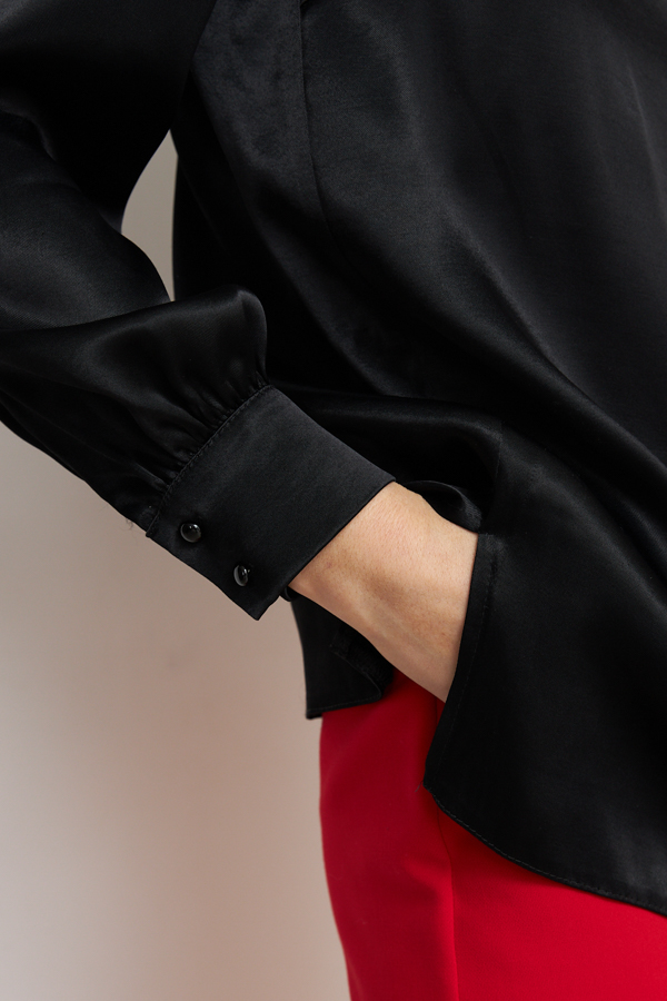 Блуза из вискозной ткани с сатиновым блеском. Свободный силуэт с разрезами в боковых швах и застёжкой на пуговицы. На задней части изделия выполнена кокетка с небольшой складкой. Вырез горловины обработан отложным воротником на стойке. Втачной рукав на манжете с застёжкой на пуговицы. Изделие украшено съемной планкой с перьями. Перед стиркой планку с перьями необходимо снять.