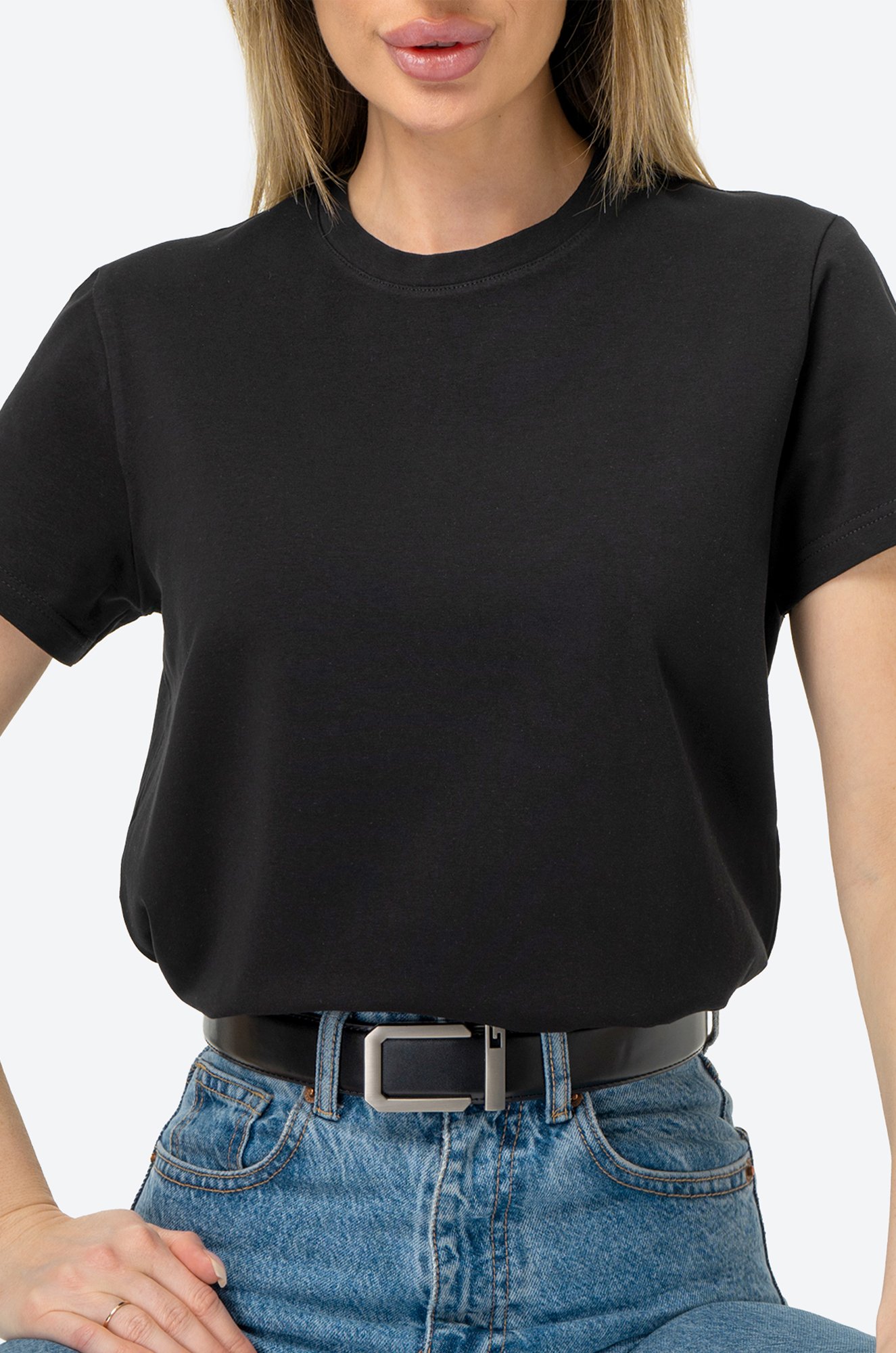 С ней невозможно расстаться! Однотонна..показатья женская футболка выполнена из хлопкового трикотажа, ткань кулирная гладь. Базовая черная футболка прямого кроя с круглой горловиной и коротким рукавом помогает создавать лаконичные повседневные образы.