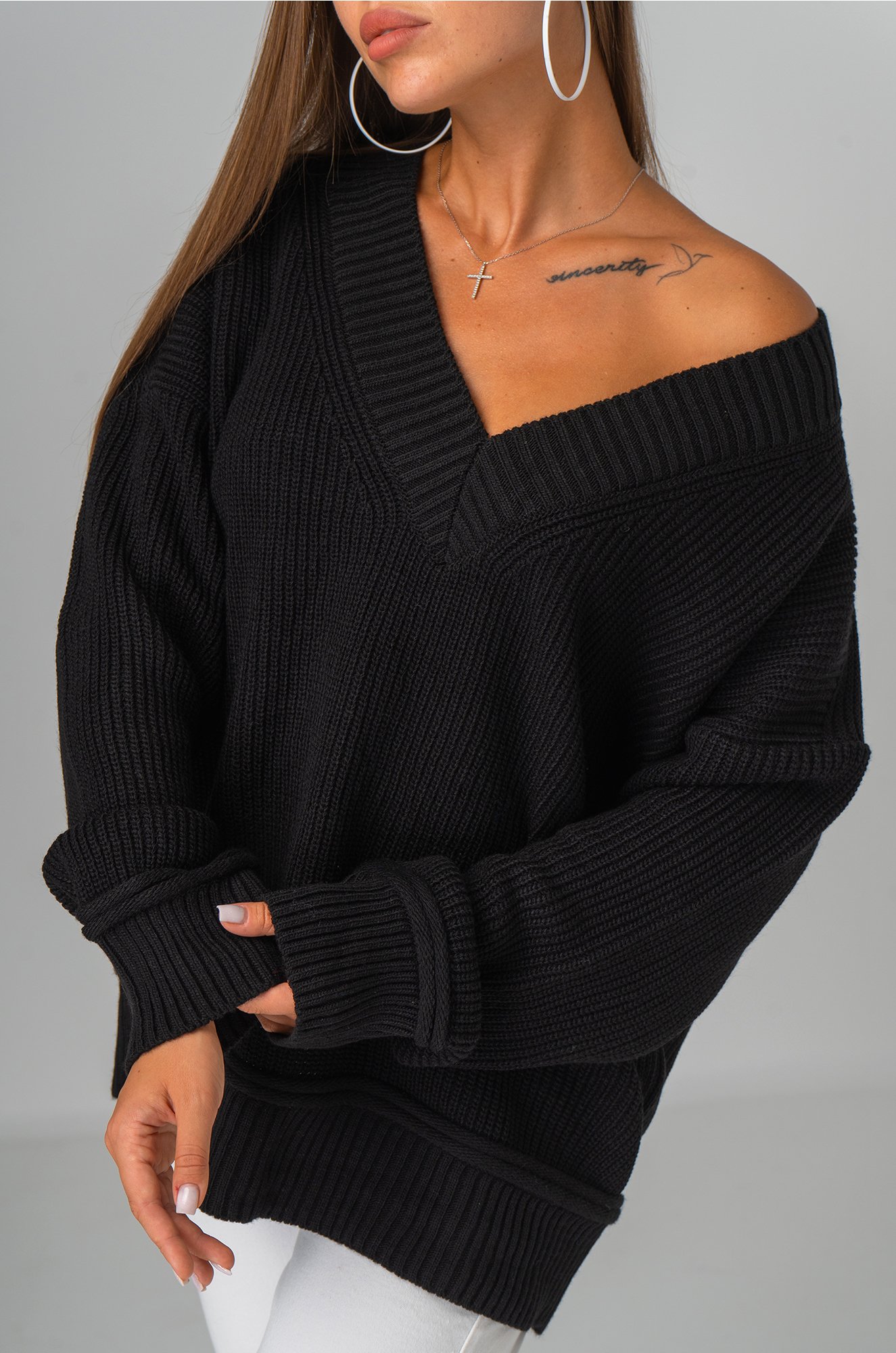 Же..показатьнский джемпер в черном цвете станет идеальным выбором для создания классного образа. Оверсайз фасон и V-образный вырез добавят легкости и элегантности, а длинный рукав гарантирует комфорт в прохладную погоду.
