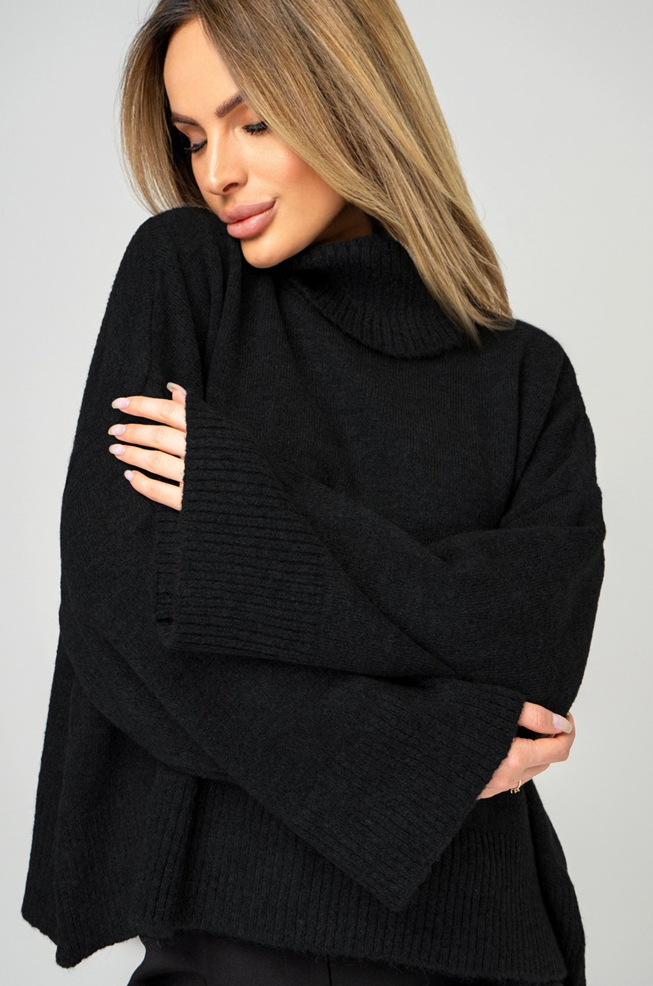 Крой oversize с длинным рукавом и спущенным плечом придаёт свитеру расслабленный и современный вид. Высокий воротник не только защищает от холода, но и подчеркивает изысканный стиль.