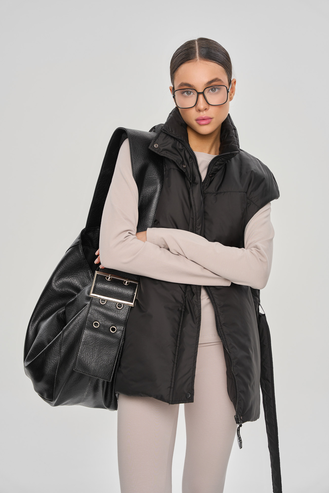 Удлиненный жилет прямого кроя свободного силуэта, со съемным поясом.