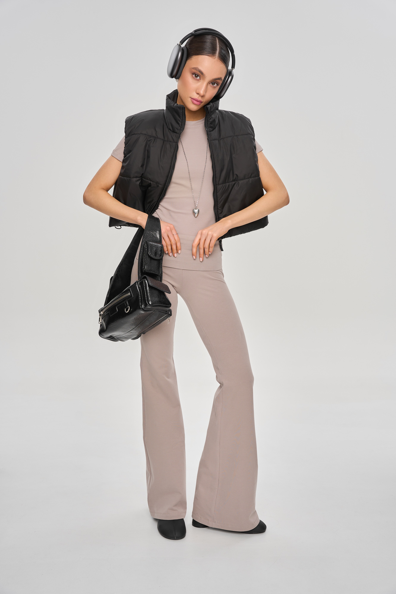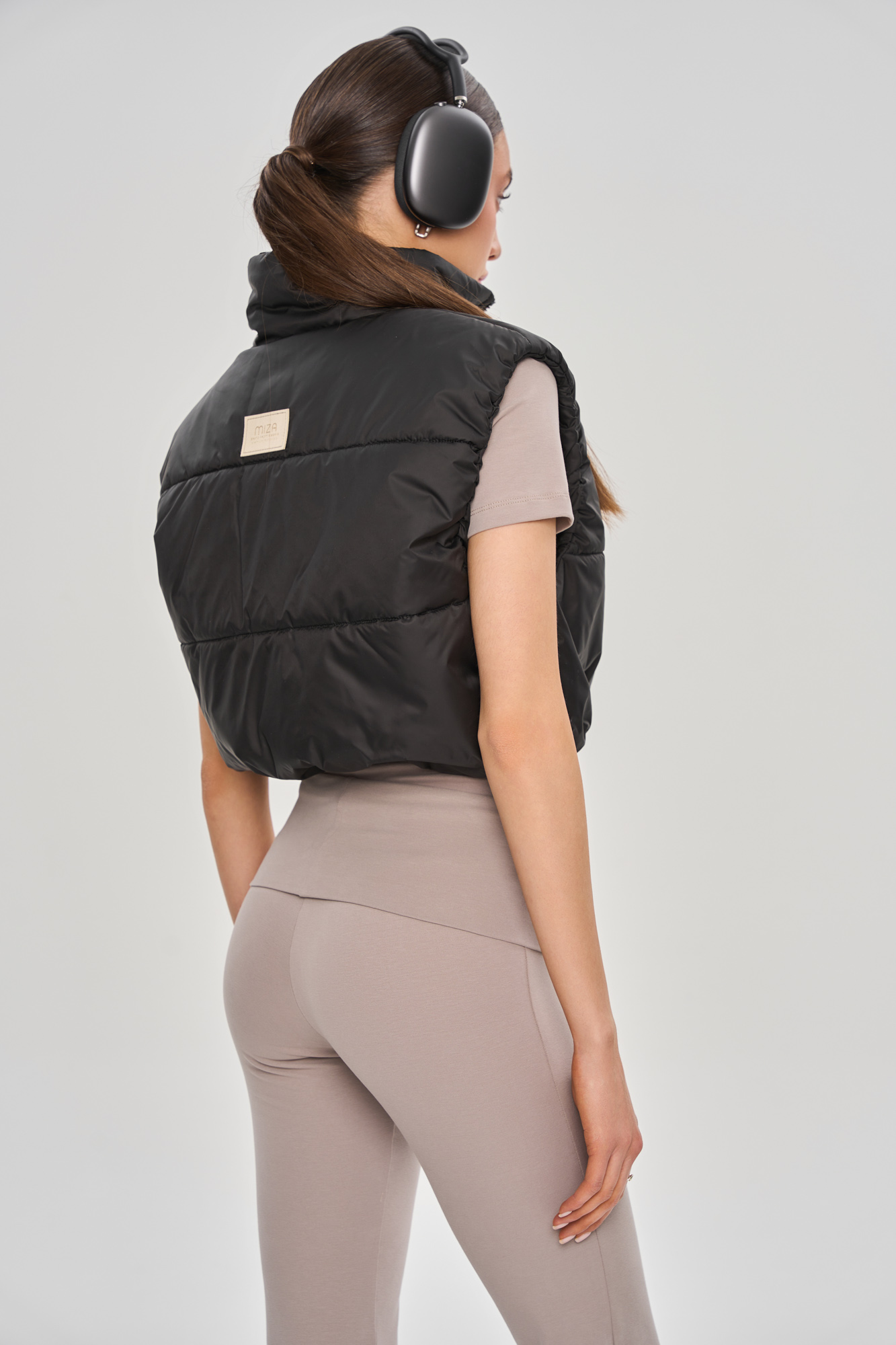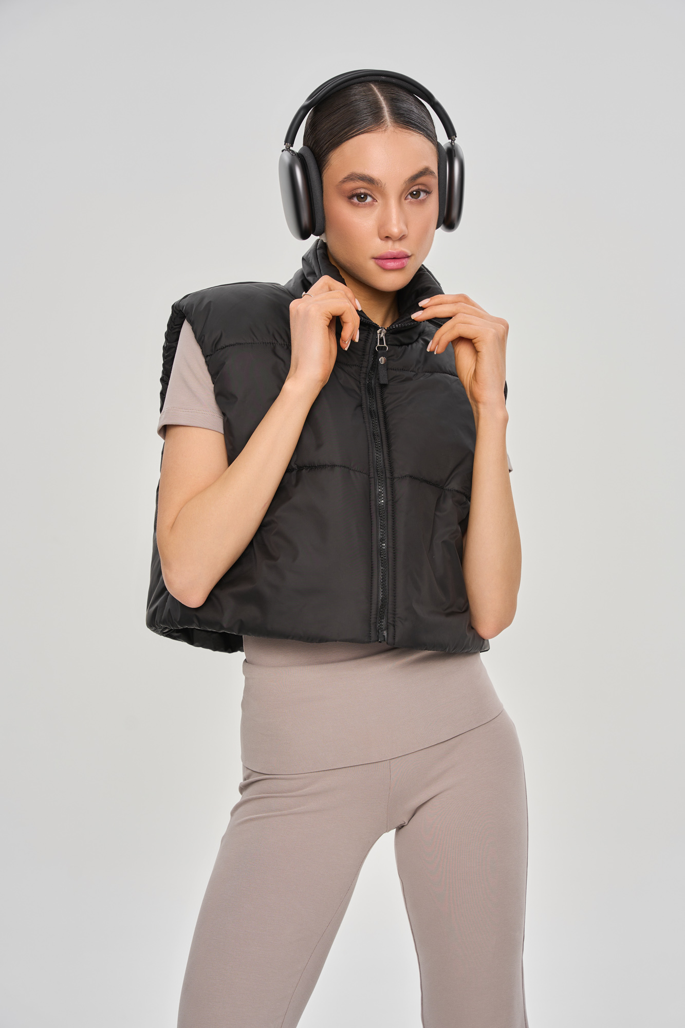Укороченный жилет прямого кроя, с застежкой на молнию и воротником-стойкой.