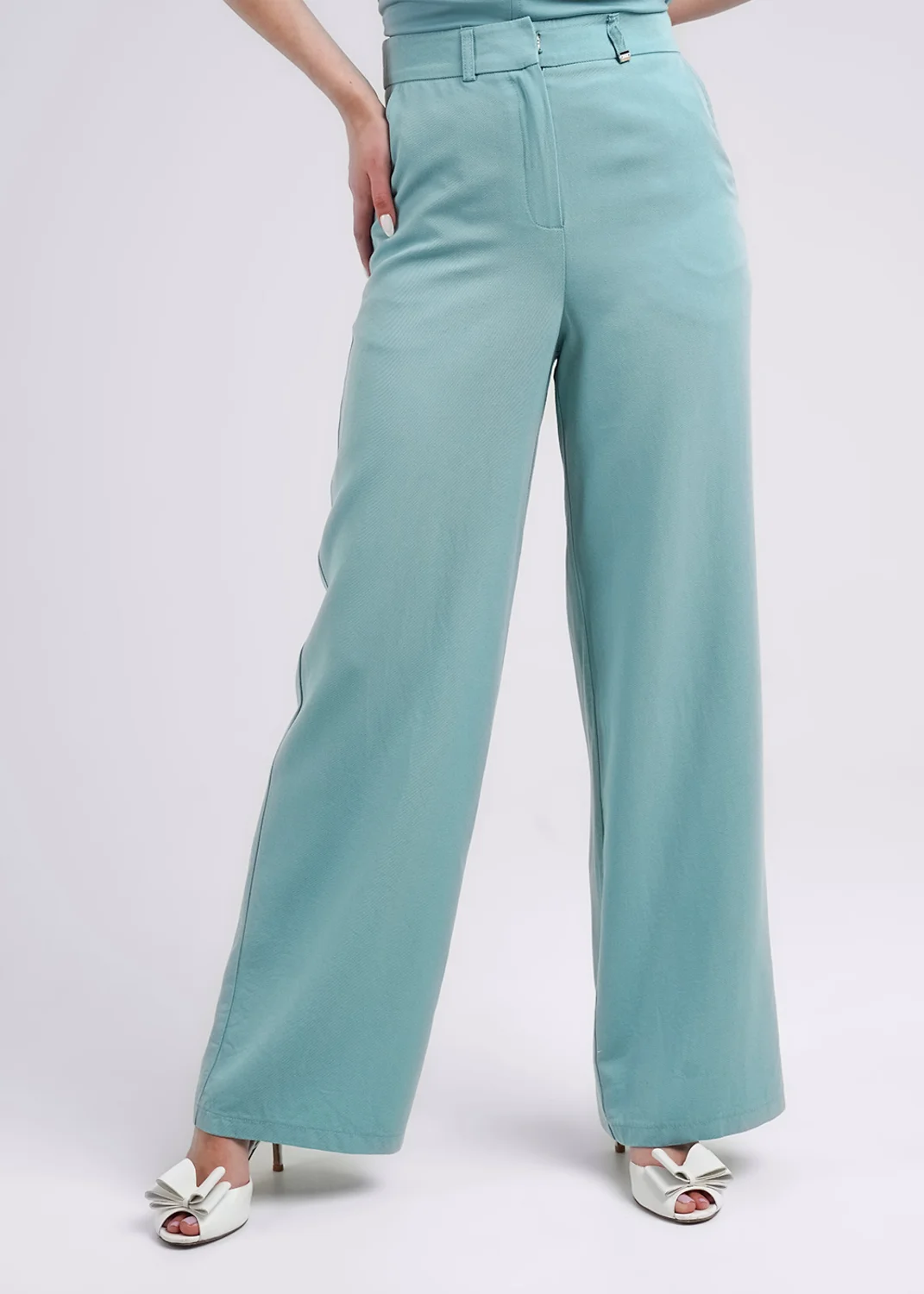 Брюки прямые, широкие из текстильного полотна штапель. Притачной пояс со шлевками, гульфиком и застежкой на молнию, крючок. Боковые карманы с отрезным бочком. По спинке вытачки, спереди металл нашивка на шлевке.