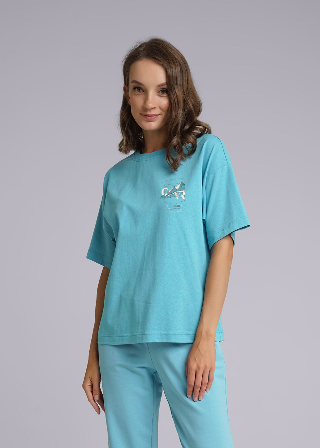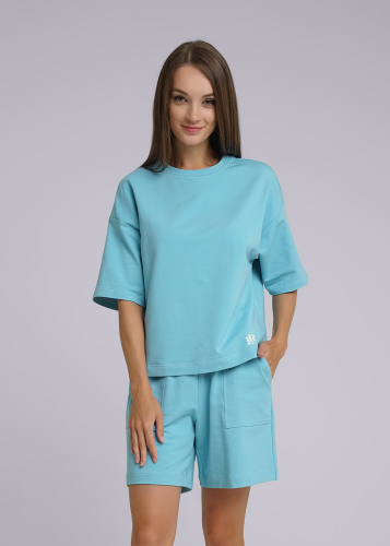 Джемпер из хлопкового трикотажного полотна. Короткий спущенный рукав. Круглый вырез горловины обработан кашкорсе. По переду принт.