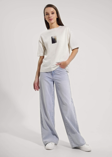 Вязаный джемпер умеренного объема из хлопковой пряжи с добавлением акрила. Короткий рукав со спущенной линией плеча. Длина рукава до локтя. Округлая горловина с бейкой. На детали переда нашивка.