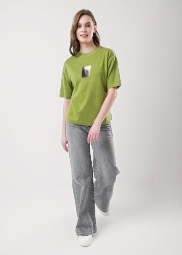 Вязаный джемпер умеренного объема из хлопковой пряжи с добавлением акрила. Короткий рукав со спущенной линией плеча. Длина рукава до локтя. Округлая горловина с бейкой. На детали переда нашивка.