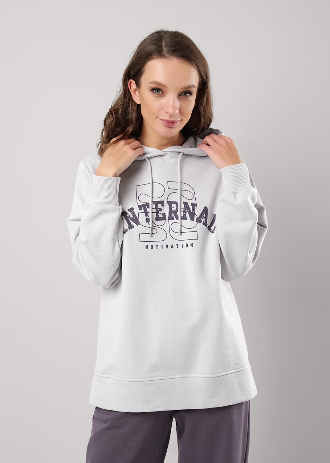 Джемпер для спорта и отдыха из футера 3х нитки с хлопком в составе. Капюшон двойной со шнуром. Длинный рукав со спущенной линией плеча. По низу рукавов манжеты из кашкорсе. На полочке принт вспенка, по низу рукава принт.