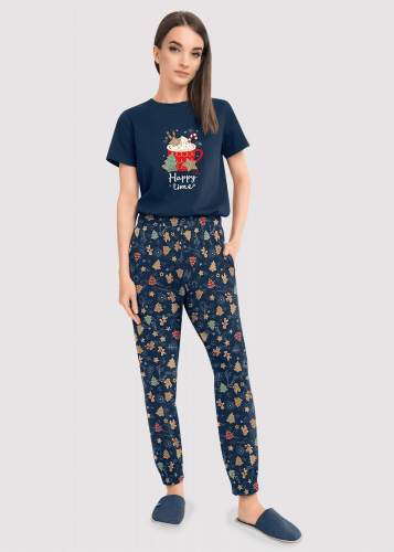 Джемпер для дома и отдыха из хлопкового футера с начесом по изнанке. Длинный рукав со спущенной линией плеча. Круглый вырез горловины. По низу изделия и рукавов притачные манжеты. По переду принт.