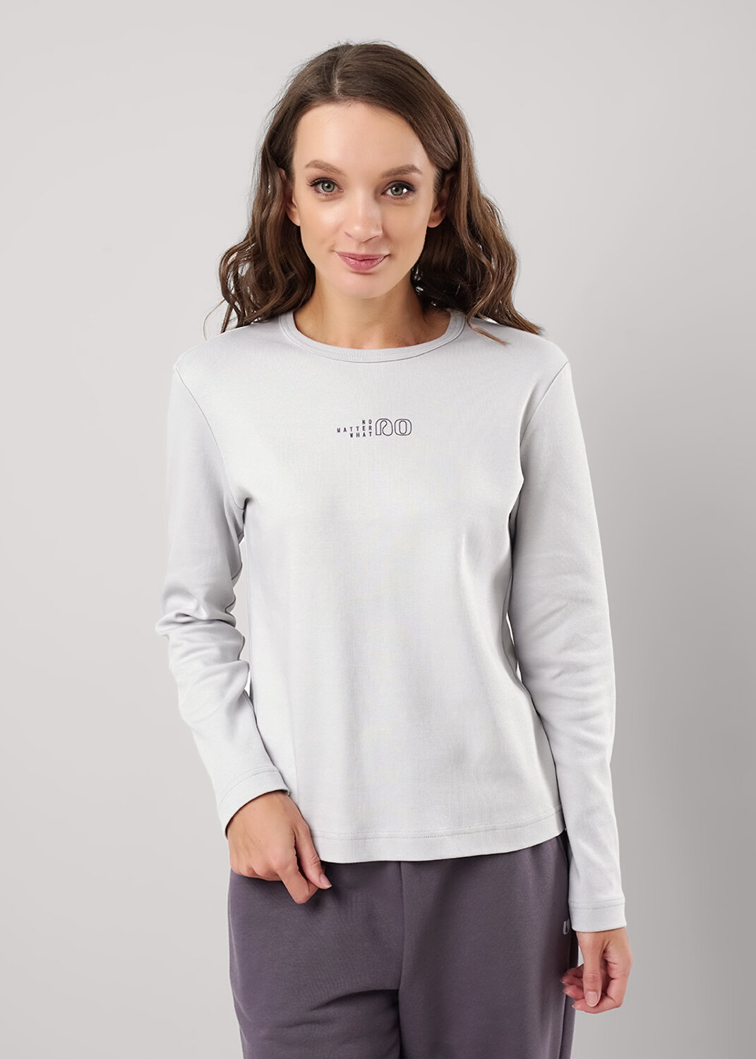 Фуфайка прямого силуэта из плотного трикотажного полотна интерлок. Втачной длинный рукав. Округлая горловина с обтачкой. Спереди принт.