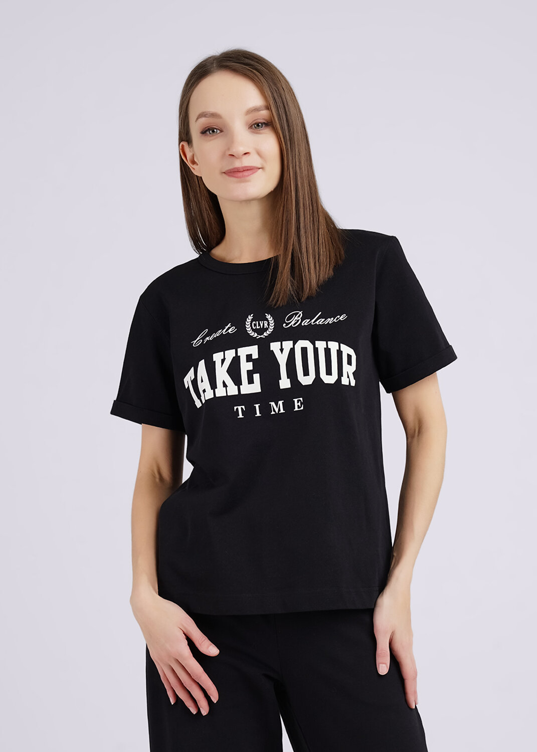 Футболка прямого силуэта с втачным рукавом из 100% хлопка, низ рукавов с отворотами, по низу ркава и на переде изделия принт