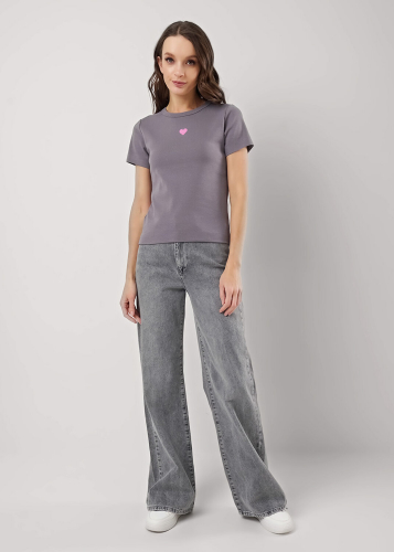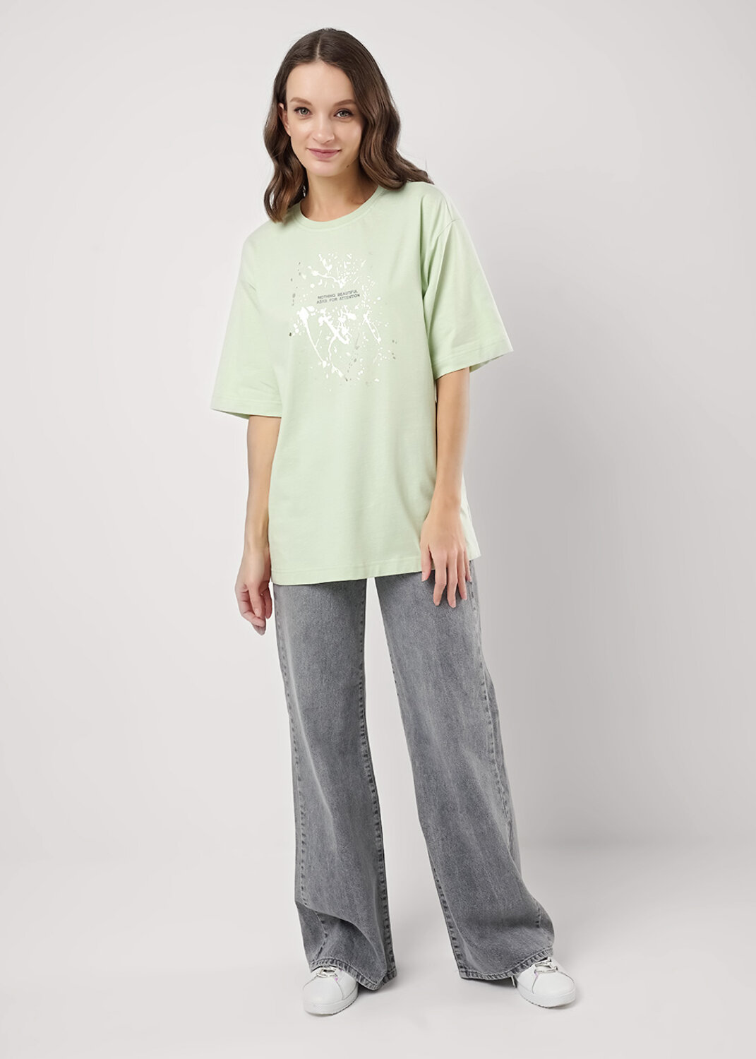 Футболка оверсайз свободного кроя из хлопкового трикотажного полотна. Слегка спущенный короткий рукав. Округлая горловина с обтачкой из рибаны. По спинке средний шов. Спереди принт с фольгой.