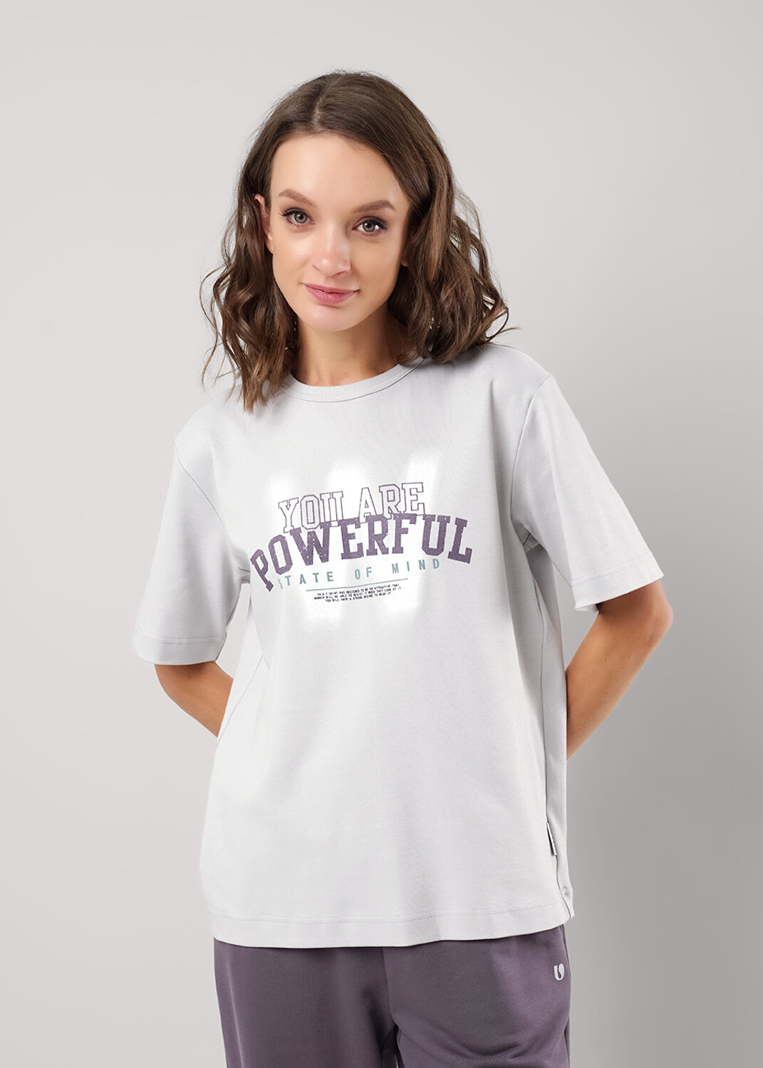 Футболка прямого силуэта из плотного хлопкового трикотажного полотна интерлок. Втачной короткий рукав. Округлая горловина с обтачкой. Сбоку вшивка,спереди принт.
