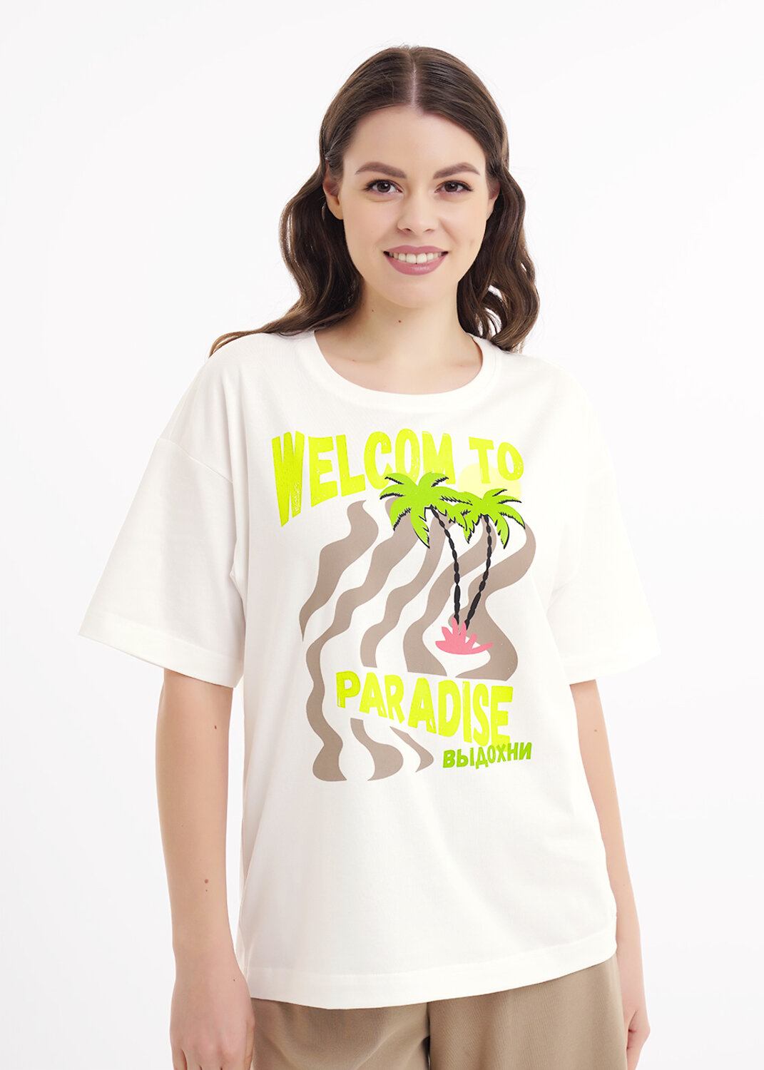Футболка для дома и отдыха из хлопкового трикотажного полотна прямого кроя. Округлая горловина с обтачкой. Короткий рукав со спущенный линией плеча, по низу рукава термонаклейка силикон. Спереди и на спинке принт.