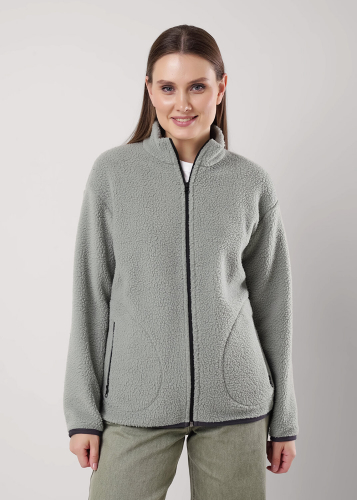 Куртка спортивная прямого силуэта из трикотажного полотна флис. По горловине отложной воротник, по борту застежка на пуговицы. Спереди накладные карманы, нашивка. Длинный рукав, внизу на манжете. Фигурный низ изделия с боковыми вставками.