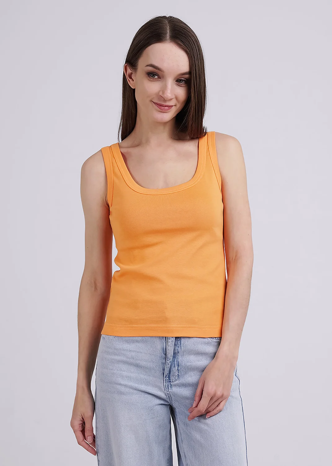 Майка из хлопкового трикотажного полотна рибана. Умеренный объем. Широкая бретель, округлая горловина. По горловине и пройме окантовка.