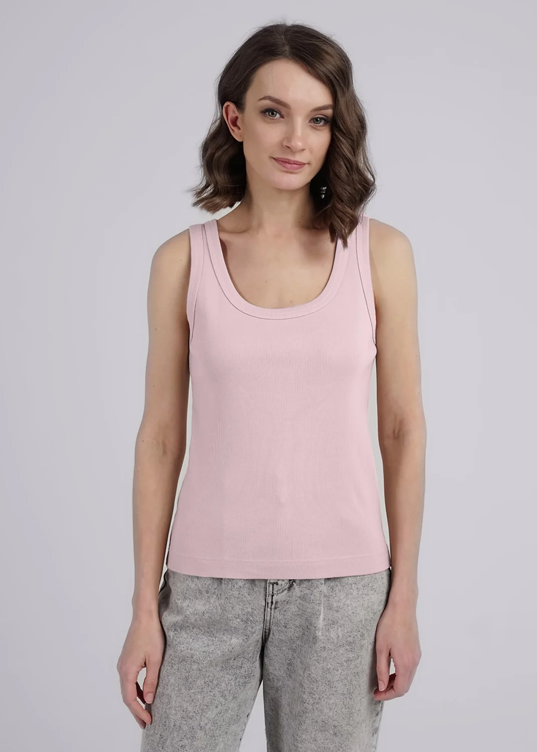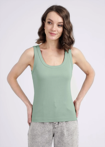 Майка из хлопкового трикотажного полотна рибана. Умеренный объем. Широкая бретель, округлая горловина. По горловине и пройме окантовка. Производство Узбекистан.