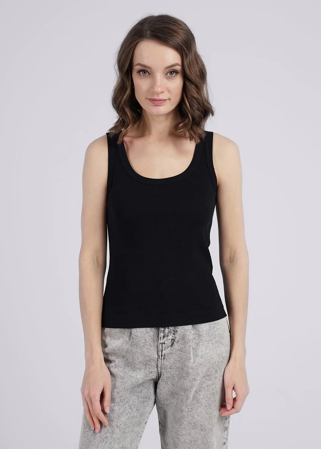 Майка из хлопкового трикотажного полотна рибана. Умеренный объем. Широкая бретель, округлая горловина. По горловине и пройме окантовка. Производство Узбекистан.