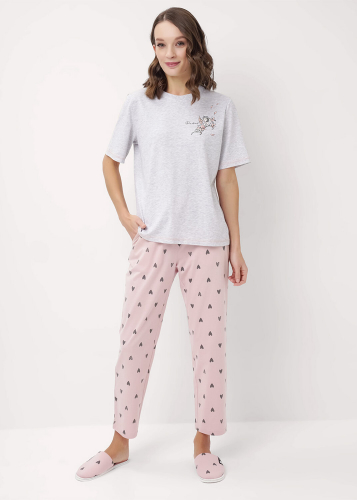 Набор одежды из трикотажного полотна.Футболка прямого кроя, горловина с обтачкой. Короткий втачной рукав.Спереди принт.По низу рукава и изделия застилы.Брюки с притачным поясом на внутренней резинке с киперной лентой. Боковые карманы с отрезным бочком.