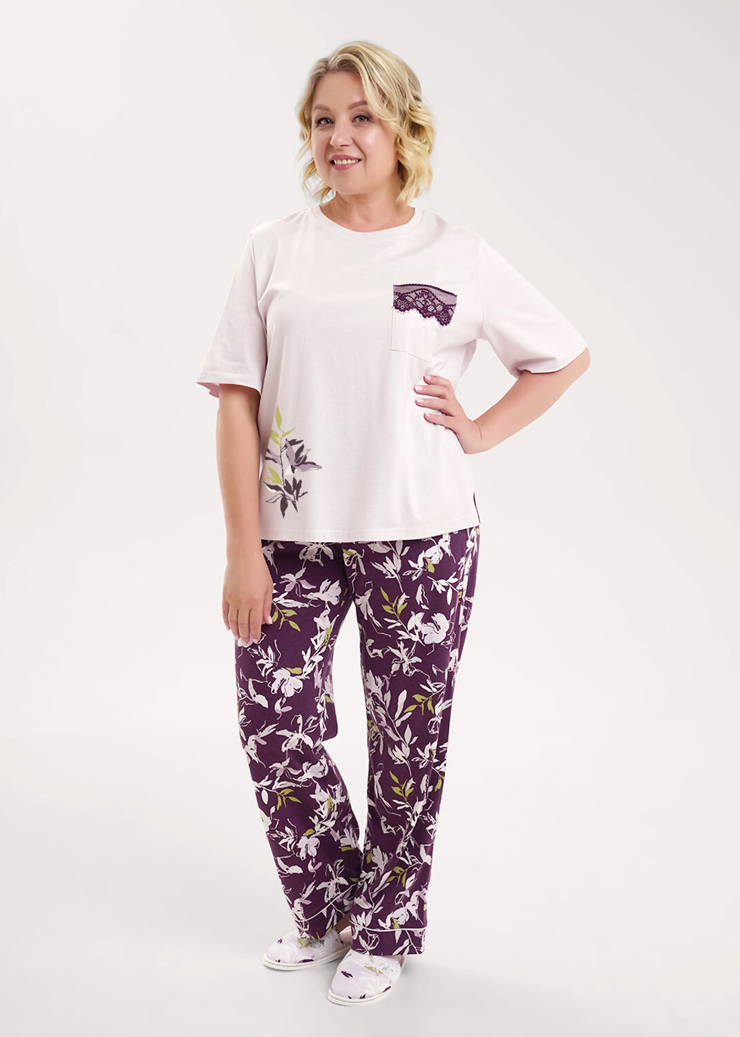 Набор одежды из трикотажного полотна с добавлением модала.Футболка прямого кроя, короткий втачной рукав. Накладной карман с кружевной вставкой.Спереди принт.Брюки по талии пояс на резинке,киперная лента. Боковые карманы с отрезным бочком.Внизу брюк кант.