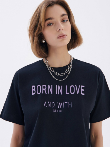 Свободная футболка из хлопка станет основой для множества расслабленных базовых образов, а стильный рисунок добавит вашему повседневному гардеробу больше индивидуальности. • умеренный oversize• классическая длина• круглый вырез горловины с планкой в рубчик• спущенная линия плеч• короткие втачные рукава• мягкий и приятный к телу хлопок• печатный рисунок «Born in love» • по спинке - лаконичная печать с логотипом бренда• сохранение формы и цвета при соблюдении рекомендаций по уходу• безупречный стиль и абсолютная свобода в движениях• всегда приятно открывать новые грани в привычной вещи.