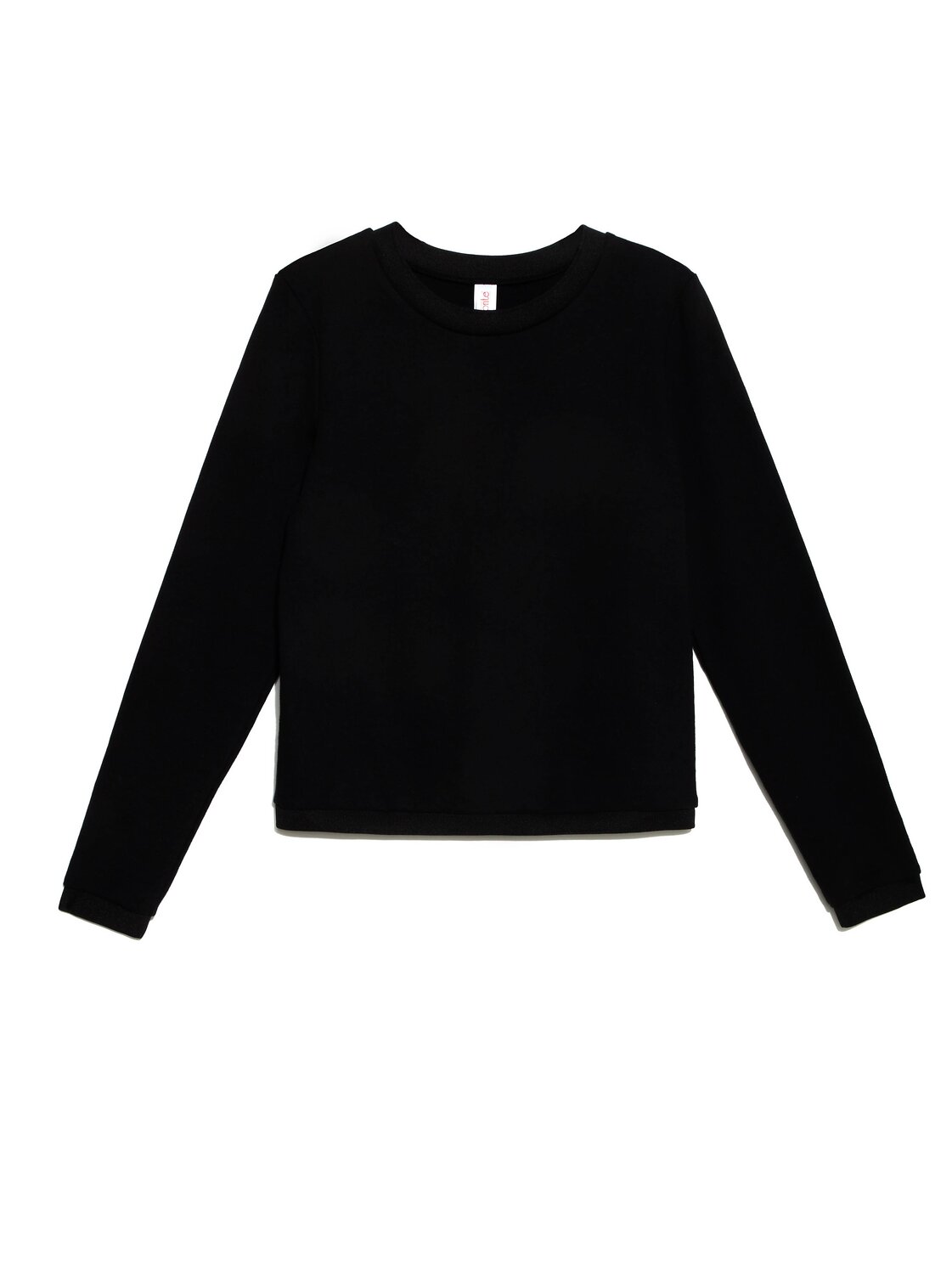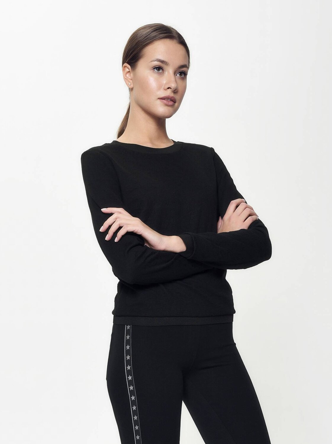 Фактурный свитшот с облегающими манжетами и притачным поясом хорошо садится на любой тип фигуры и прекрасно дополняет базовый женский гардероб.