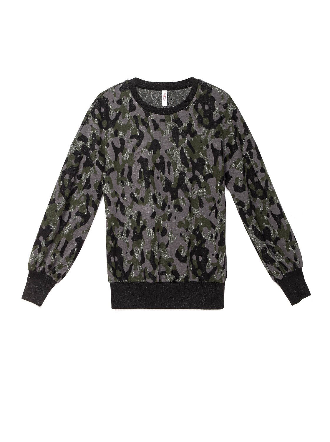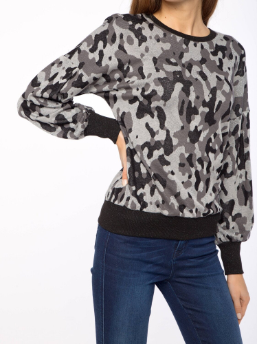В этом джемпере прекрасно все: нежные цвета, металлический блеск, ультрамодный камуфляжный принт, длинные втачные рукава, постепенно расширяющиеся книзу по всей длине и собранные на манжету.