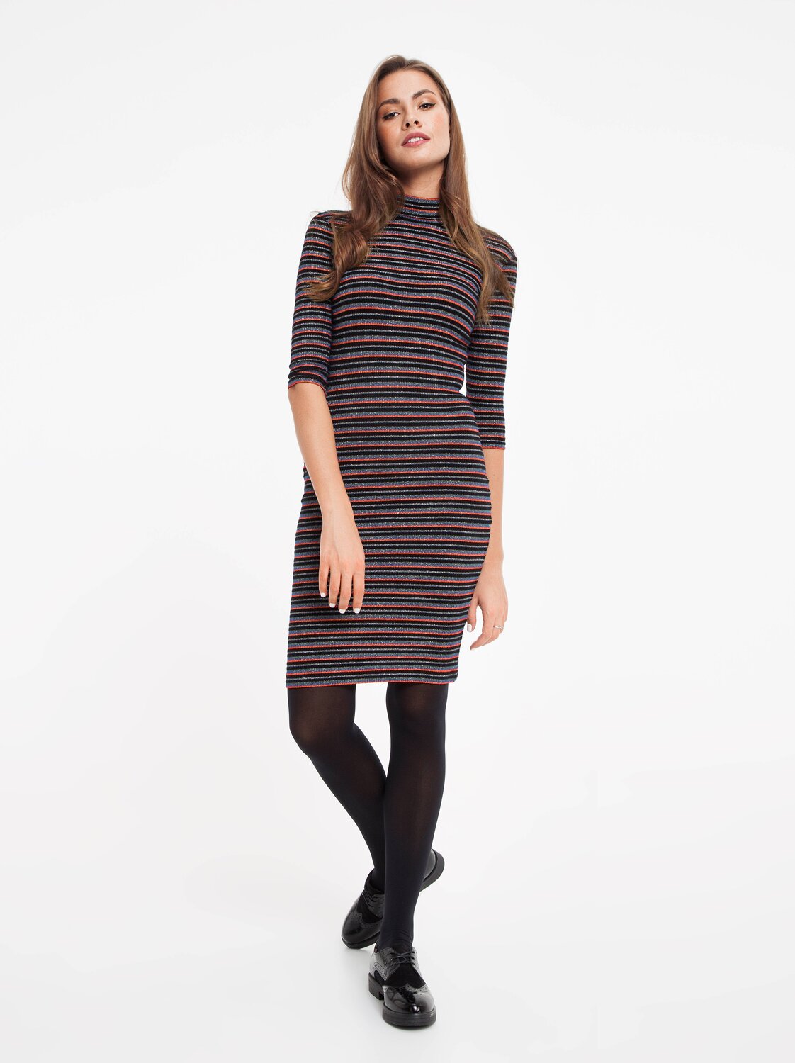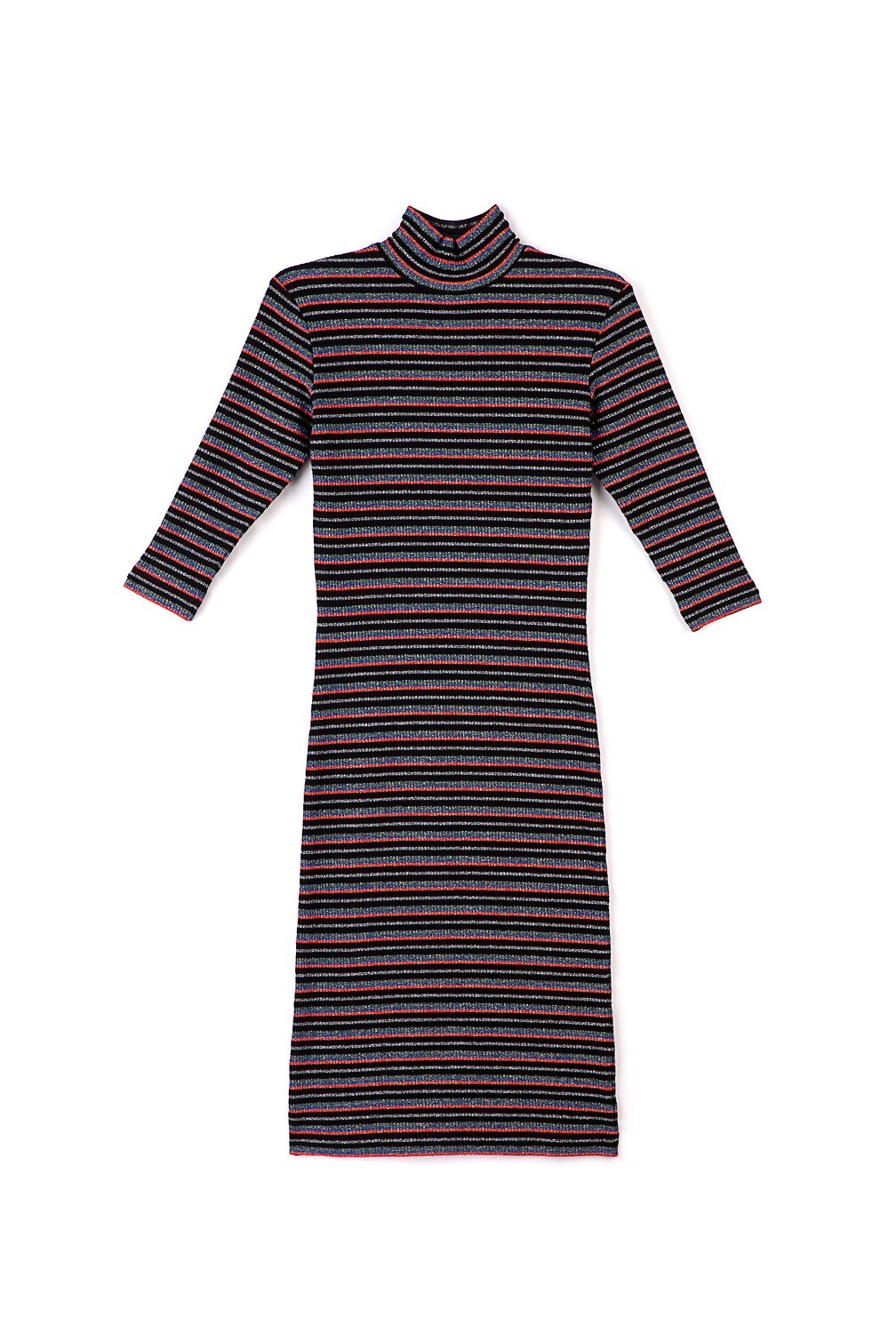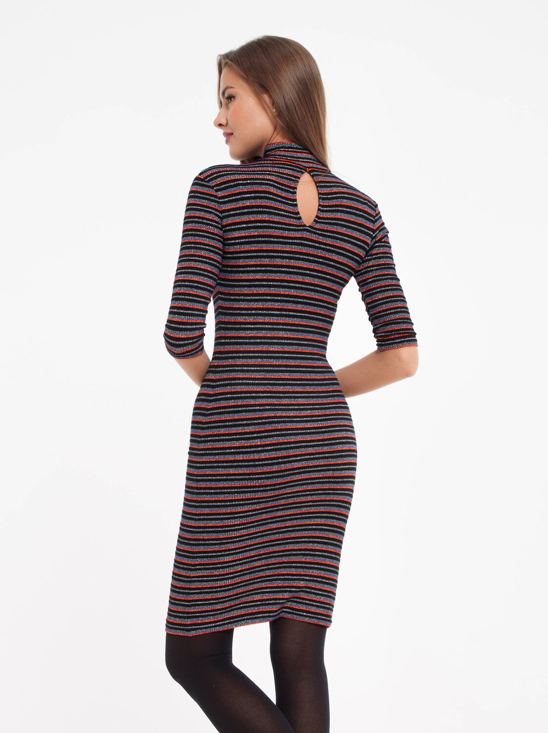 Длинный рукав, соблазнительный разрез "капелька" по спинке, высокая горловина, трендовые полоски, стильный блеск нитей люрекса - это трикотажное платье гарантированно станет вашим любимым!