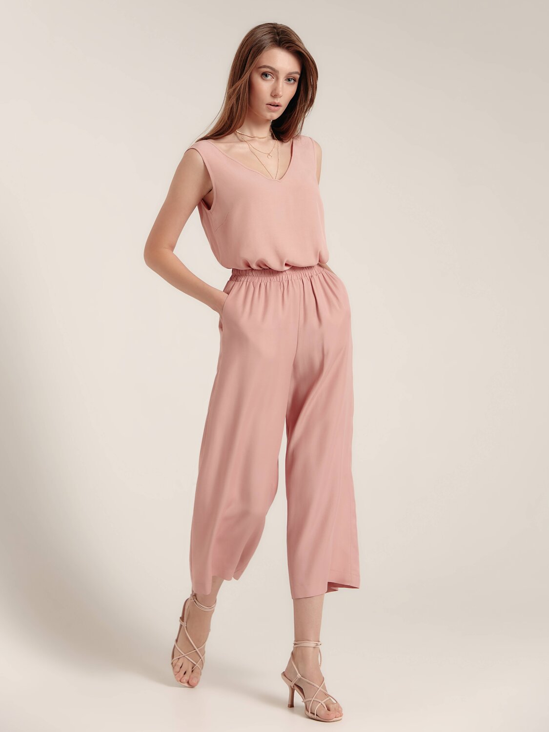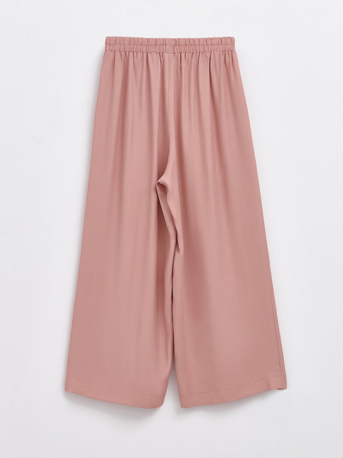 Брюки женские из текстильной ткани. По переду в боковых швах выполнены карманы. Верх изделия обработан притачным поясом с эластичной тесьмой по спинке.