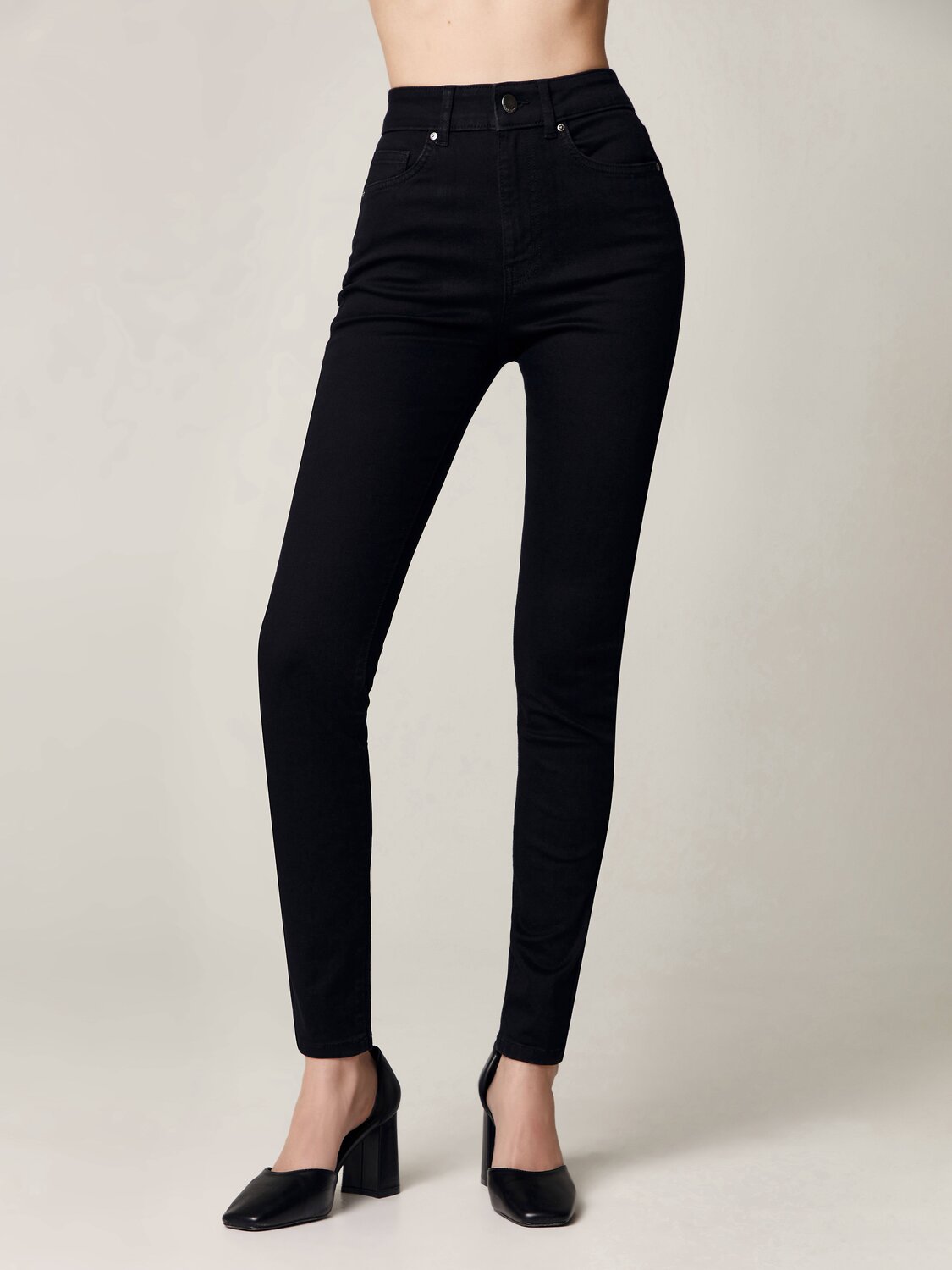 Классические черные джинсы skinny с высокой посадкой, подчеркивающей талию, созданы для адептов комфорта и минимализма. Модель потрясающе садятся по фигуре и легко сочетается с большинством вещей базового гардероба.
