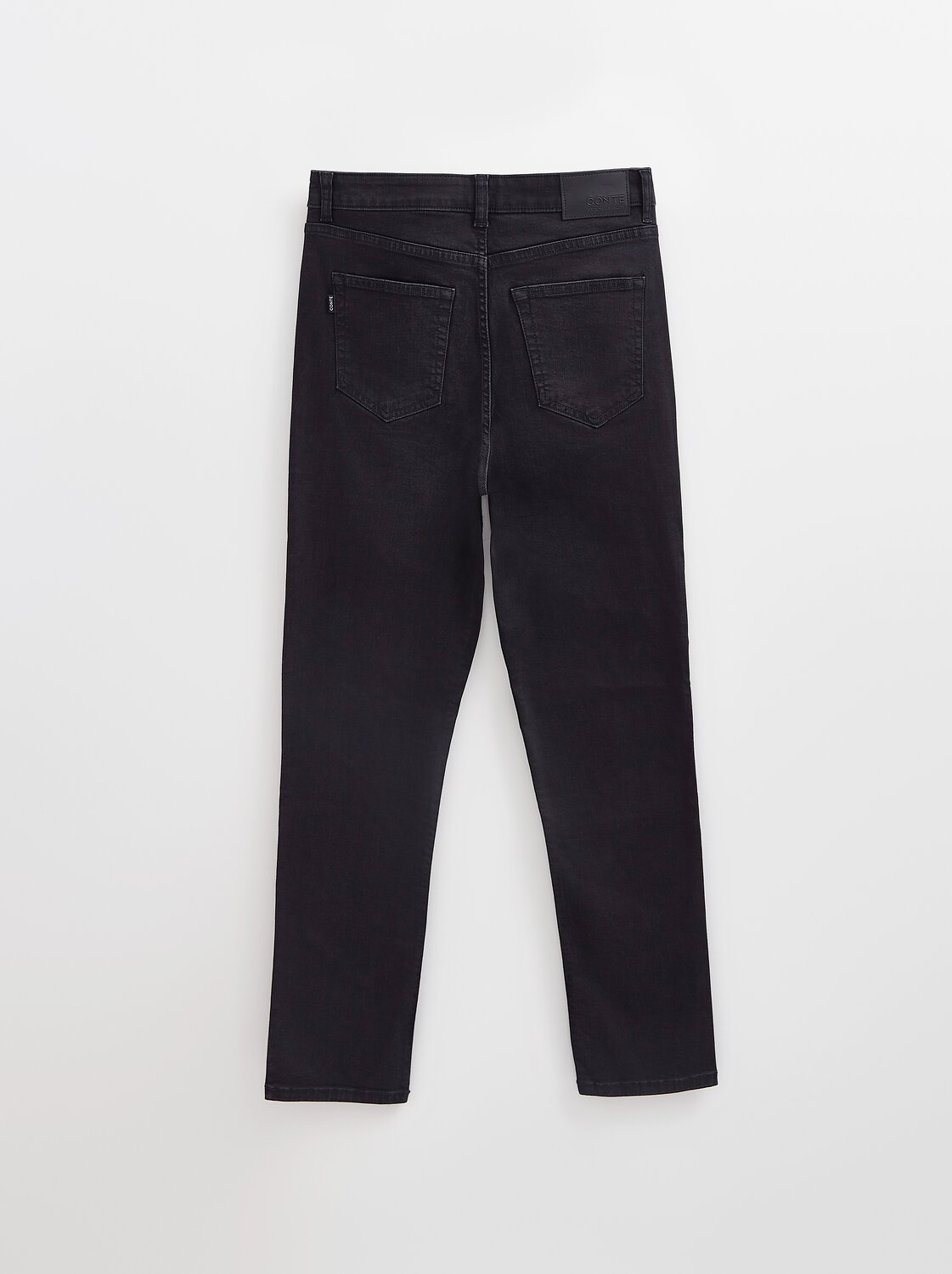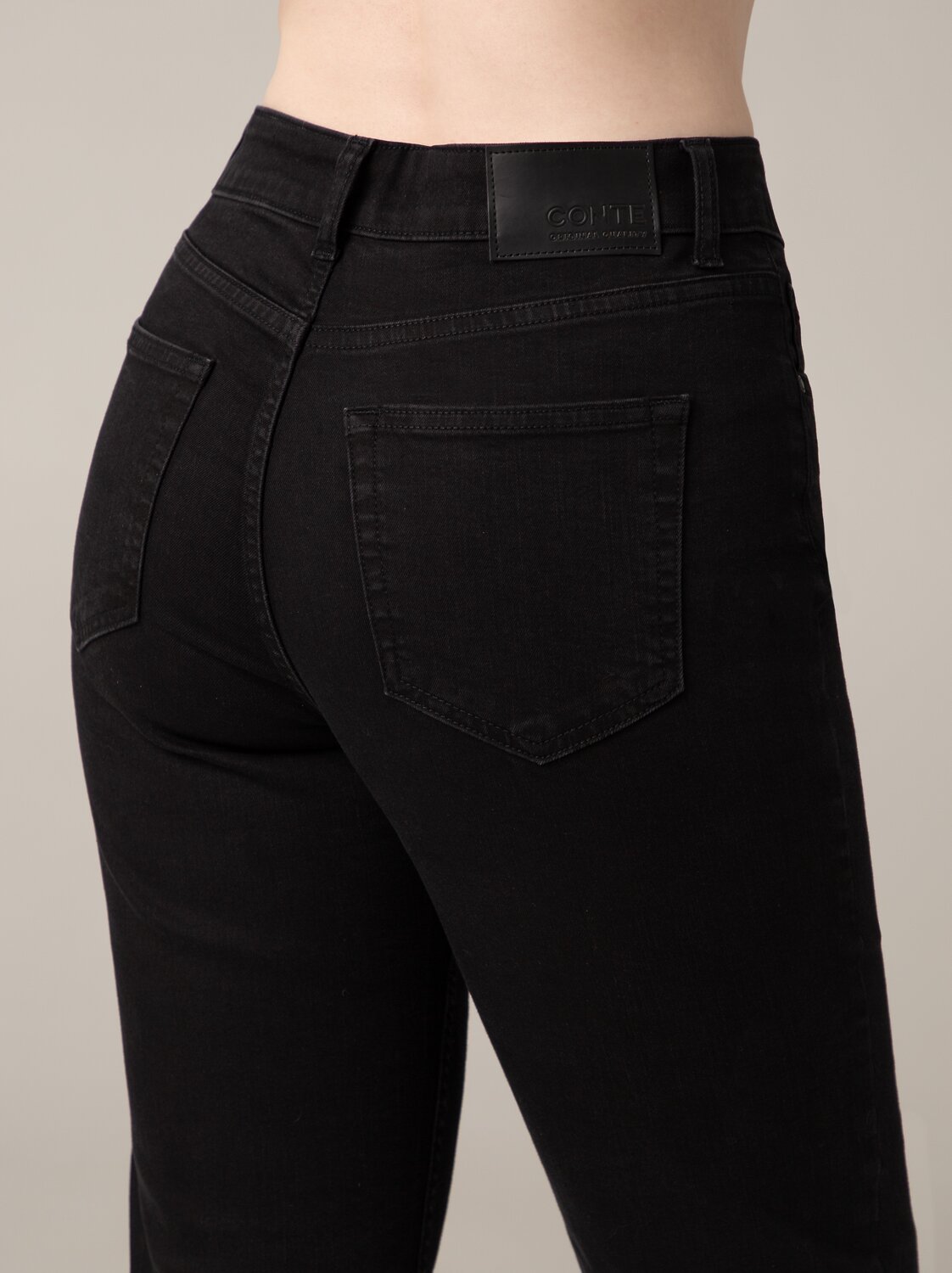 Джинсы с высокой посадкой из плотного, но эластичного денима красиво и комфортно садятся по фигуре, не добавляя силуэту ненужный объем.