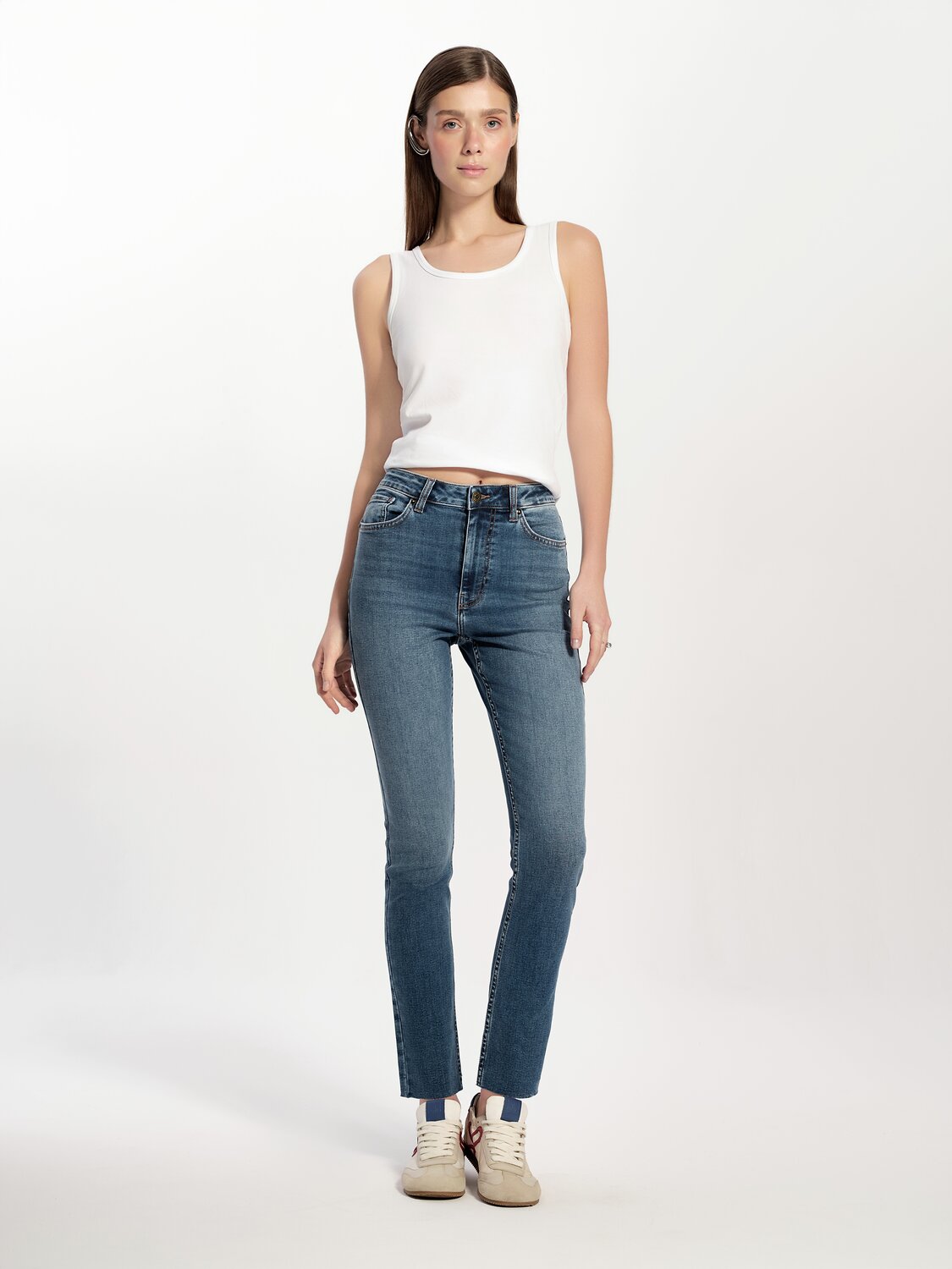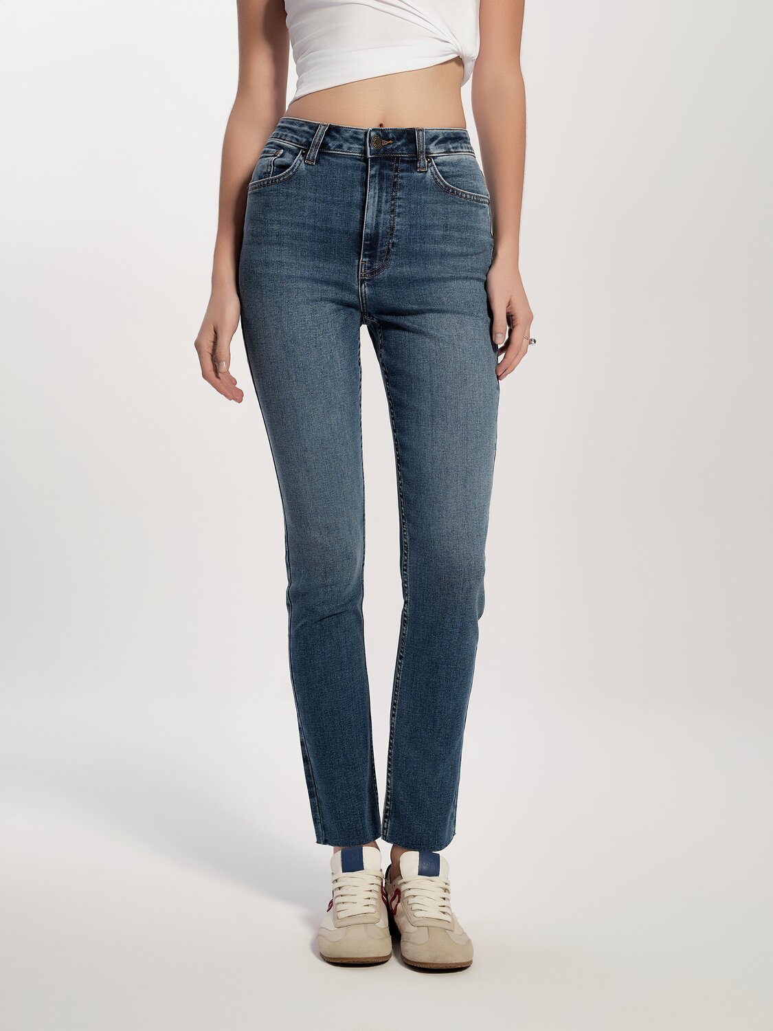 Джинсы skinny – классика, которая идеально подчеркнёт вашу фигуру. Эффект потёртостей, благородный синий цвет, комфортная посадка передают уникальный стиль модели.