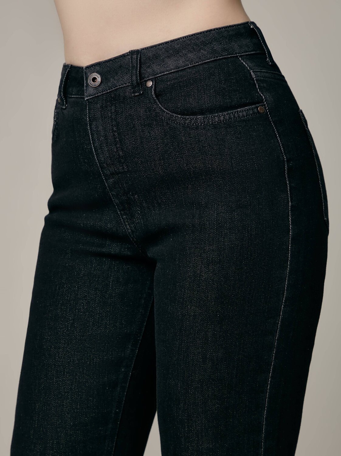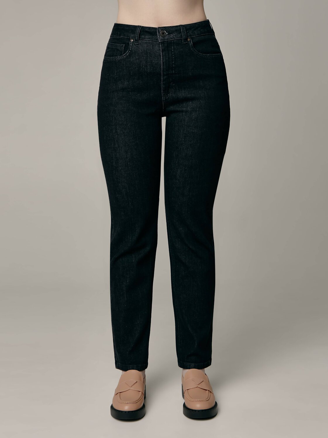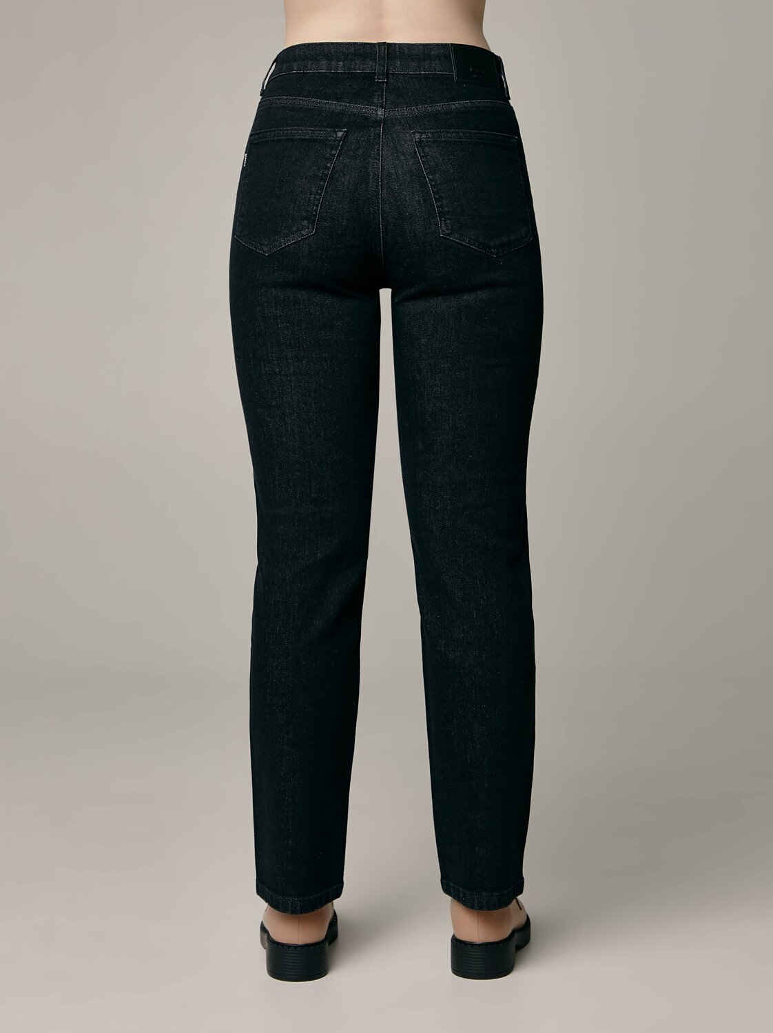 Джинсы с высокой посадкой из плотного, но эластичного денима красиво и комфортно садятся по фигуре, не добавляя силуэту ненужный объем.