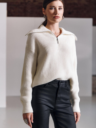 Джемпер свободного силуэта с V-образным вырезом и отложным воротником-поло поможет создавать множество новых повседневных и офисных образов, не изменяя собственному стилю и комфорту.