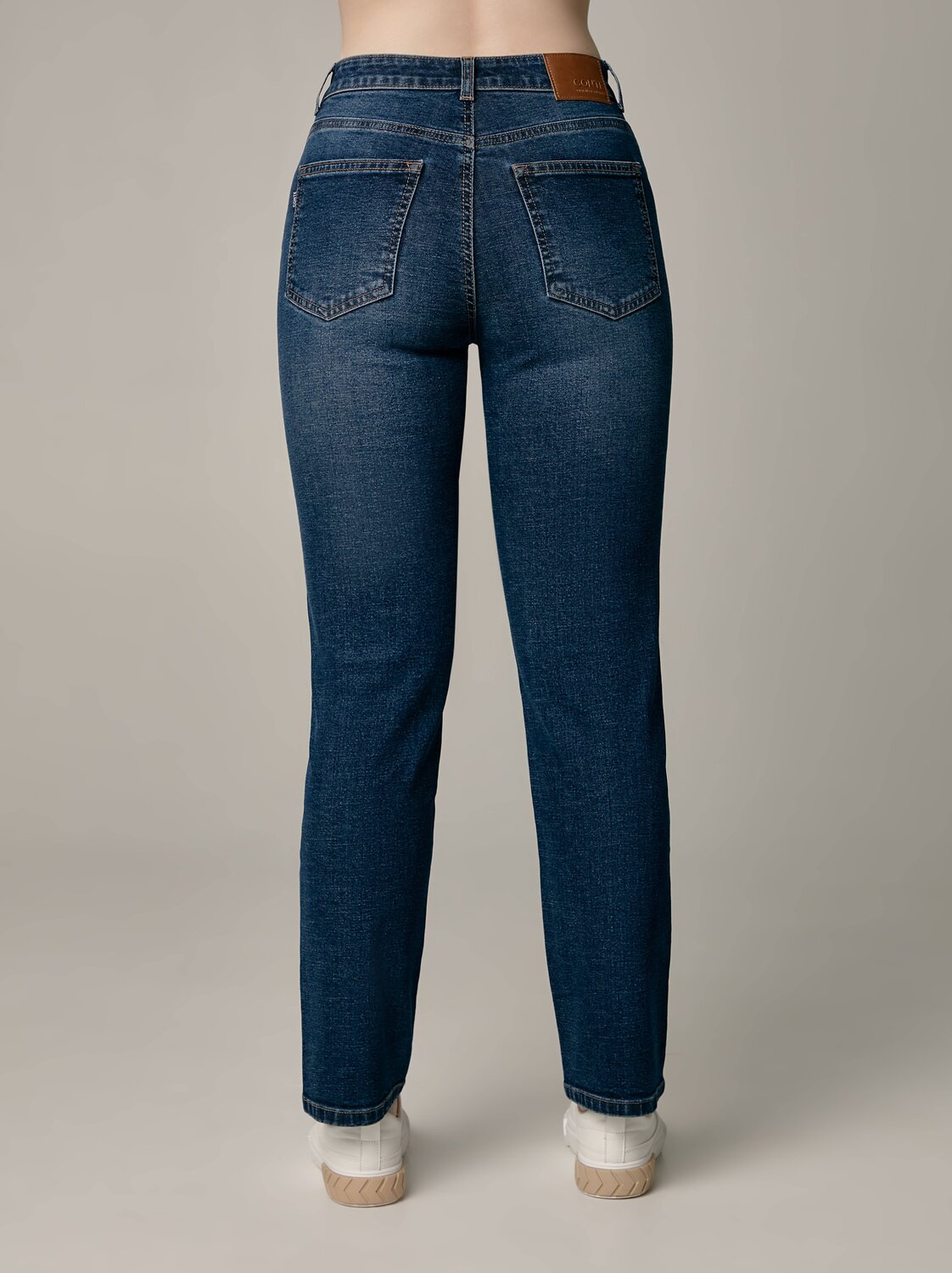 Джинсы с высокой посадкой из плотного, но эластичного денима красиво и комфортно садятся по фигуре, не добавляя силуэту ненужный объем.