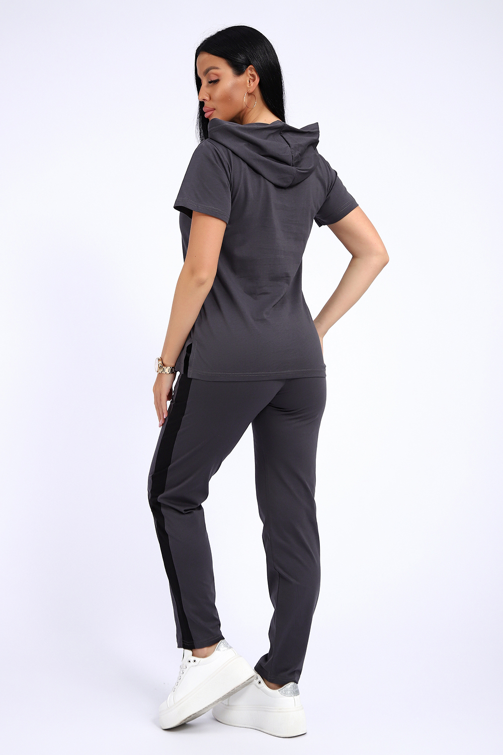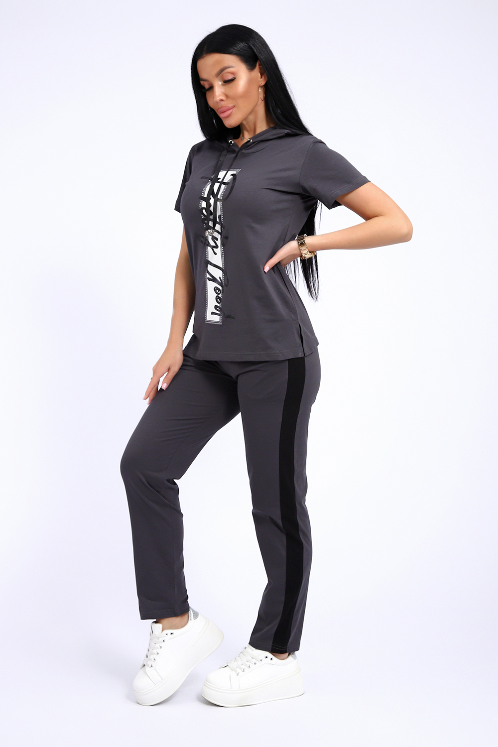 Стильный женский костюм из легкой дышащей ткани. Сшит из мягкого трикотажного полотна высокого качества. Основной изюминкой костюма является яркий принт на полочке кофты, расположенный вертикально и контрастирующий с общим фоном. Кроме того, на кофте имеется капюшон, объем которого регулируется тонкой лентой. Этот универсальный и практичный повседневный костюм в спортивном стиле будет удобным и комфортным во многих ситуациях. Комплект отлично подойдет для спорта, бега или танцев. Брюки свободные с яркими лампасами, двумя боковыми карманами, на широком поясе с резинкой. Каждую вещь вполне можно использовать по отдельности. Комплект отлично подойдет для женщин любого возраста и поможет хозяйке выглядеть стильно, при этом даря чувство комфорта! Цвет: черный;бежевый;антрацитовый; Материал: кулирка с лайкрой;кулирка с лайкрой; Состав: 92% хлопок, 8% лайкра.