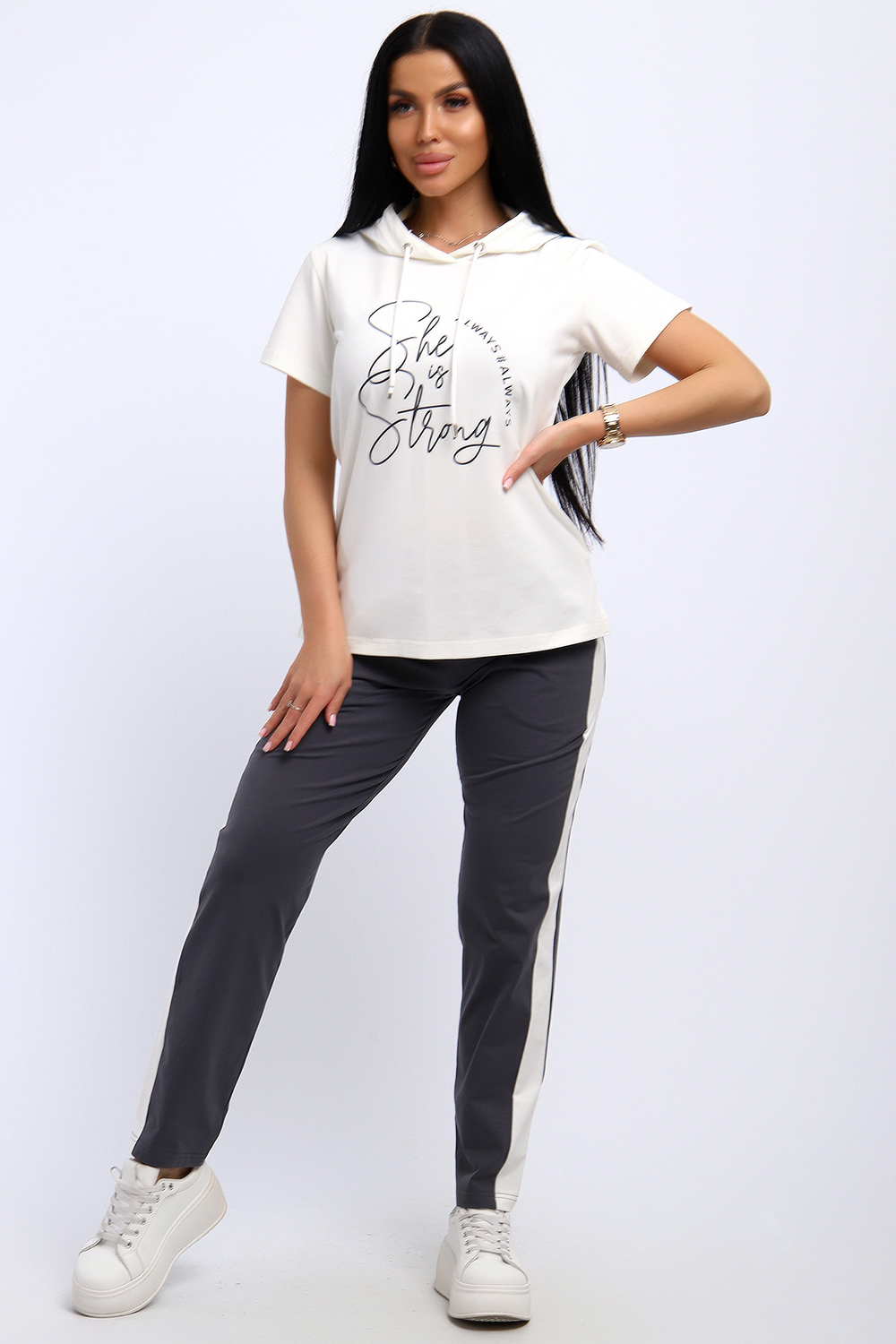 Удобный, женственный трикотажный костюм со спортивной ноткой подарит вам чувство комфорта и позволит выглядеть сногсшибательно в любой ситуации! Костюм прекрасно подойдет для занятий спортом, пробежек или прогулок! Кофта белого цвета, с надписью латинскими буквами в цвет брюк, имеет капюшон, способный защитить волосы от солнечных лучей, ветра или дождя. Объем капюшона регулирует изящный шнурок. На брюках имеются лампасы белого цвета, гармонирующие с цветом кофты.