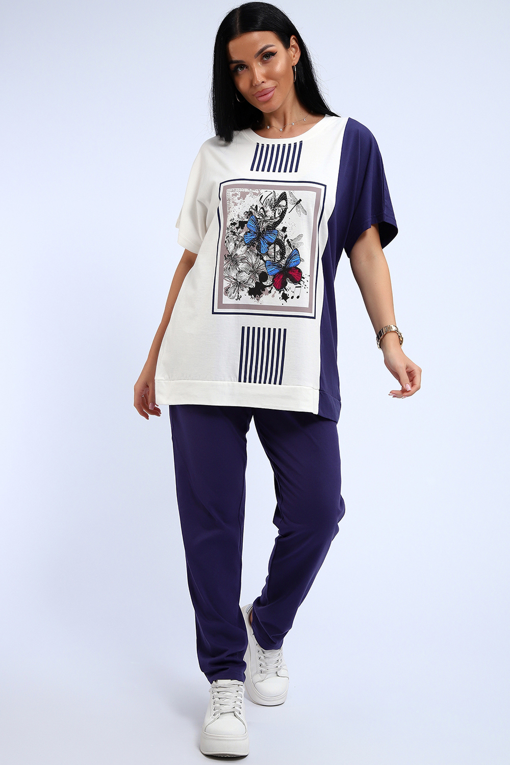 Эффектный костюм в спортивном стиле из трикотажного полотна ярких оттенков. В комплекте представлена кофта свободного кроя со спущенным рукавом и узкие, но не обтягивающие брюки. Изюминкой костюма является сочетание контрастных оттенков в дизайне кофты, украшенная яркими цветами. Трикотажные костюмы стали одним из самых популярных и востребованных атрибутов в гардеробе современных женщин, так как не только подчеркивают стиль и индивидуальность, но и обеспечивают комфорт и удобство в повседневной жизни. Цвет: фиолетовый;зеленый;темно-синий; Материал: кулирка;кулирка; Состав: хлопок 100%.