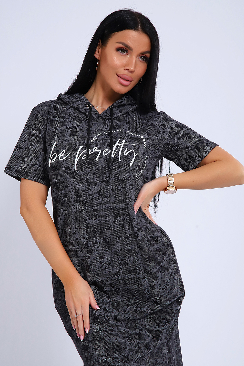 Легкое хлопковое платье из трикотажной ткани с капюшоном. Оригинальный дизайн ткани имитирует расцветку кожи змеи, что придает изделию особую изюминку и загадочность. Дополнительным украшением служит контрастная надпись на полочке, выполненная белыми латинскими буквами. Объем капюшона регулируется изящным черным шнурком. Для вашего удобства в боковых швах спрятаны глубокие карманы.