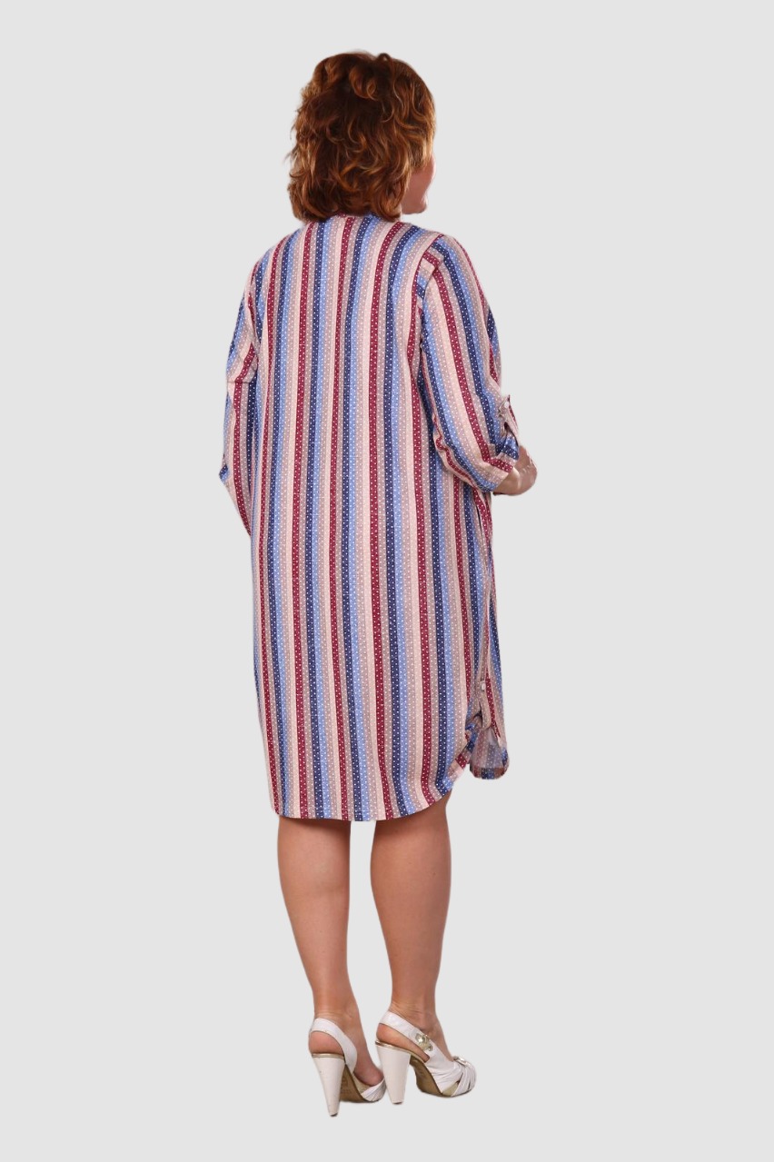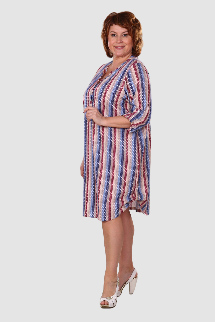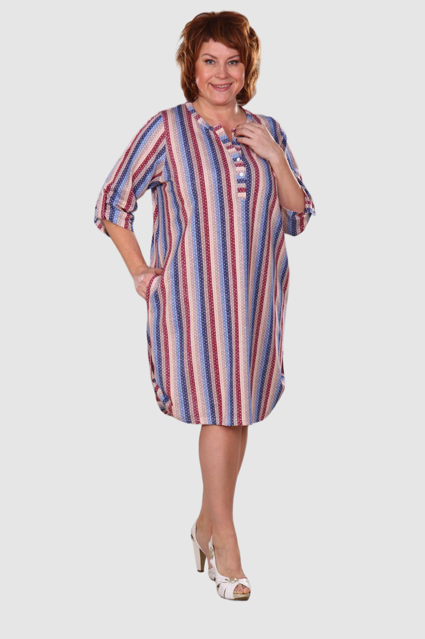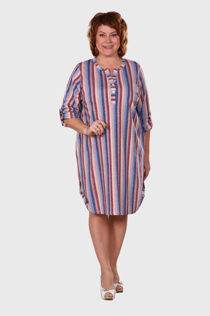 Легкое и нежное женское платье- туника,  выполнено из хлопкового трикотажного полотна. Туника средней длины, прямого покроя с внутренними карманами в боковых швах.  Рукав 3/4. Фигурный низ изделия и рукава декорированы патами на пуговицах. Туника идеально подойдет для женщины с любым типом фигуры. Отличный вариант на каждый день!